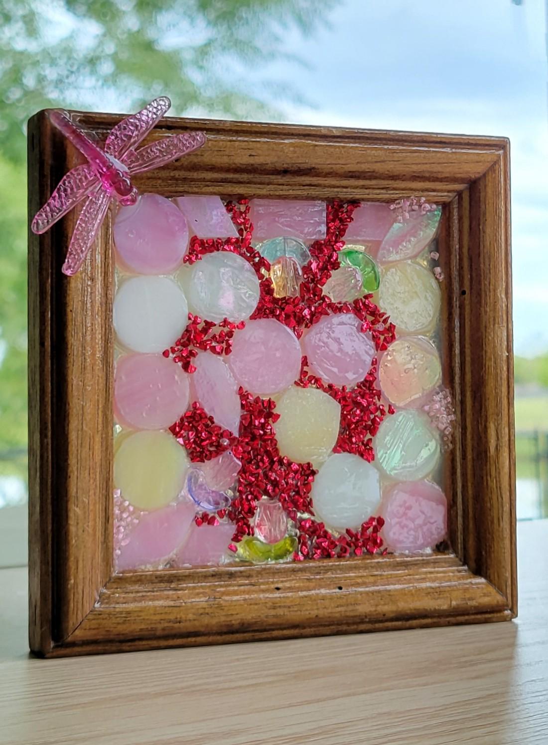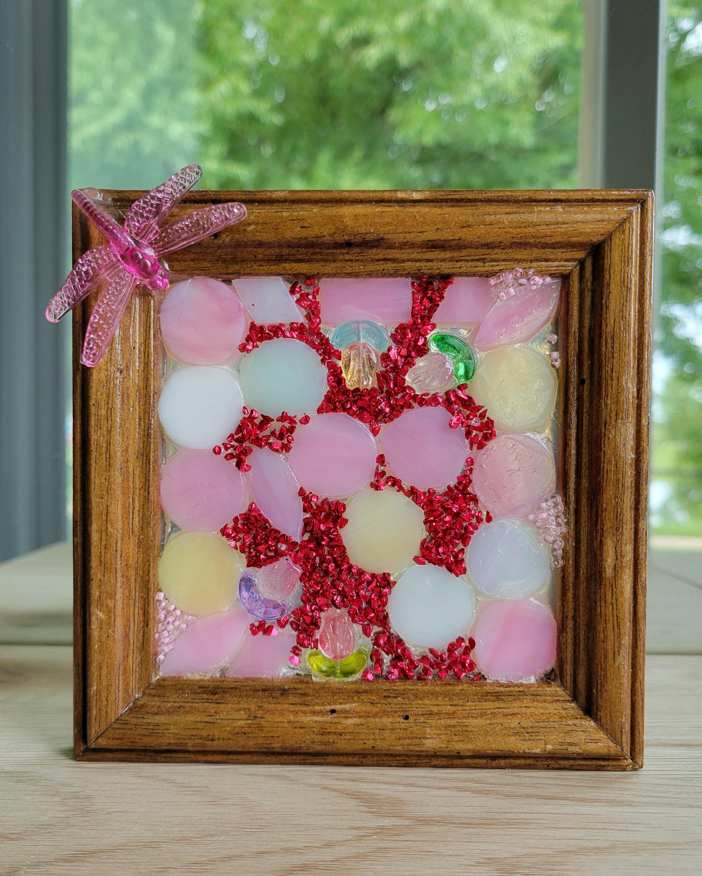 Repurposed picture frame adorned with colored glass, glass beads, and glass glitter. Ready to hang or can be placed on a table or wherever you’d like. 5x5