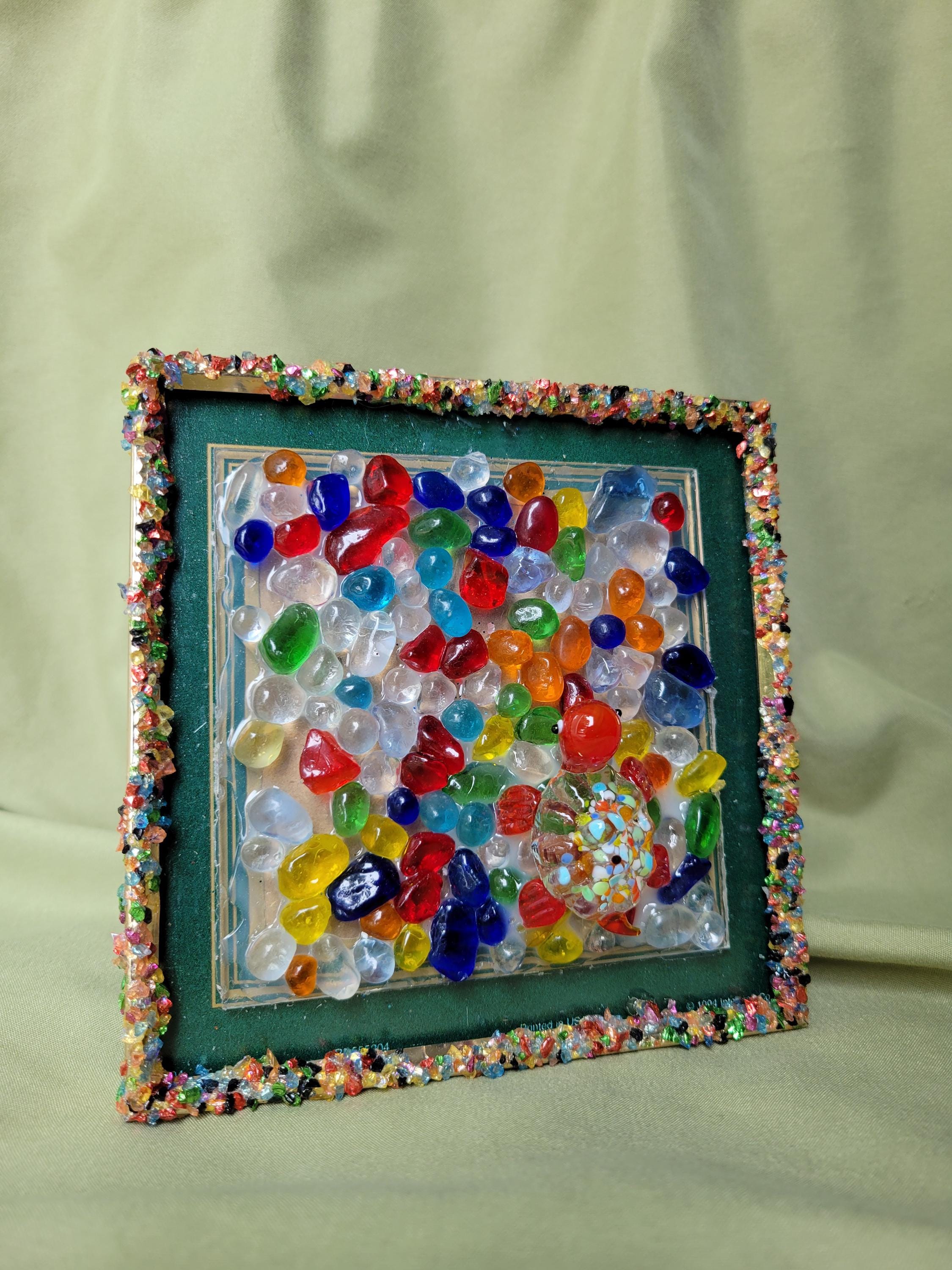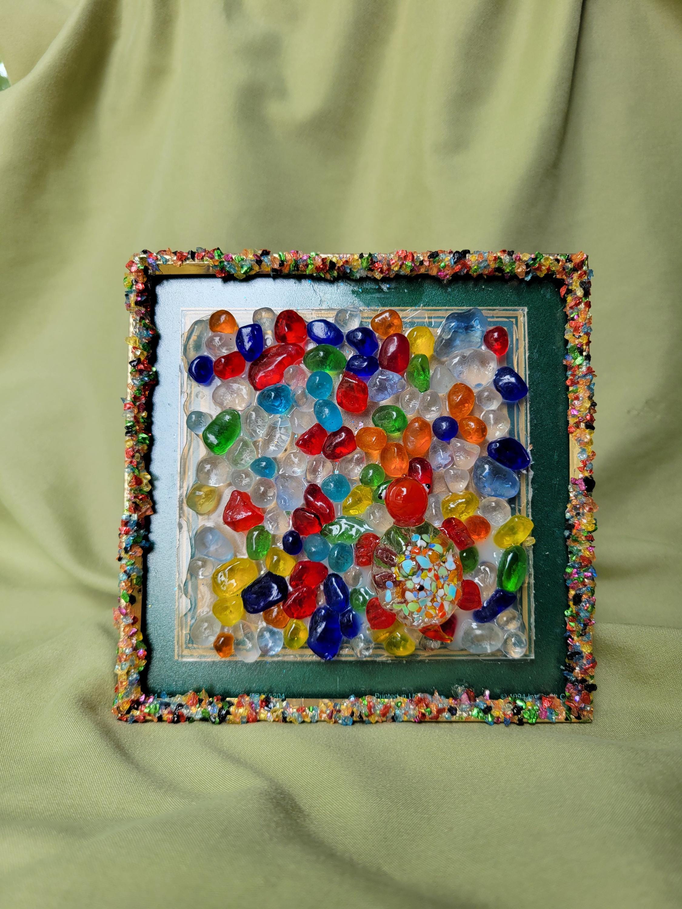 Repurposed frame adorned with glass stones, glass glitter, and an adorable glass turtle.5x5