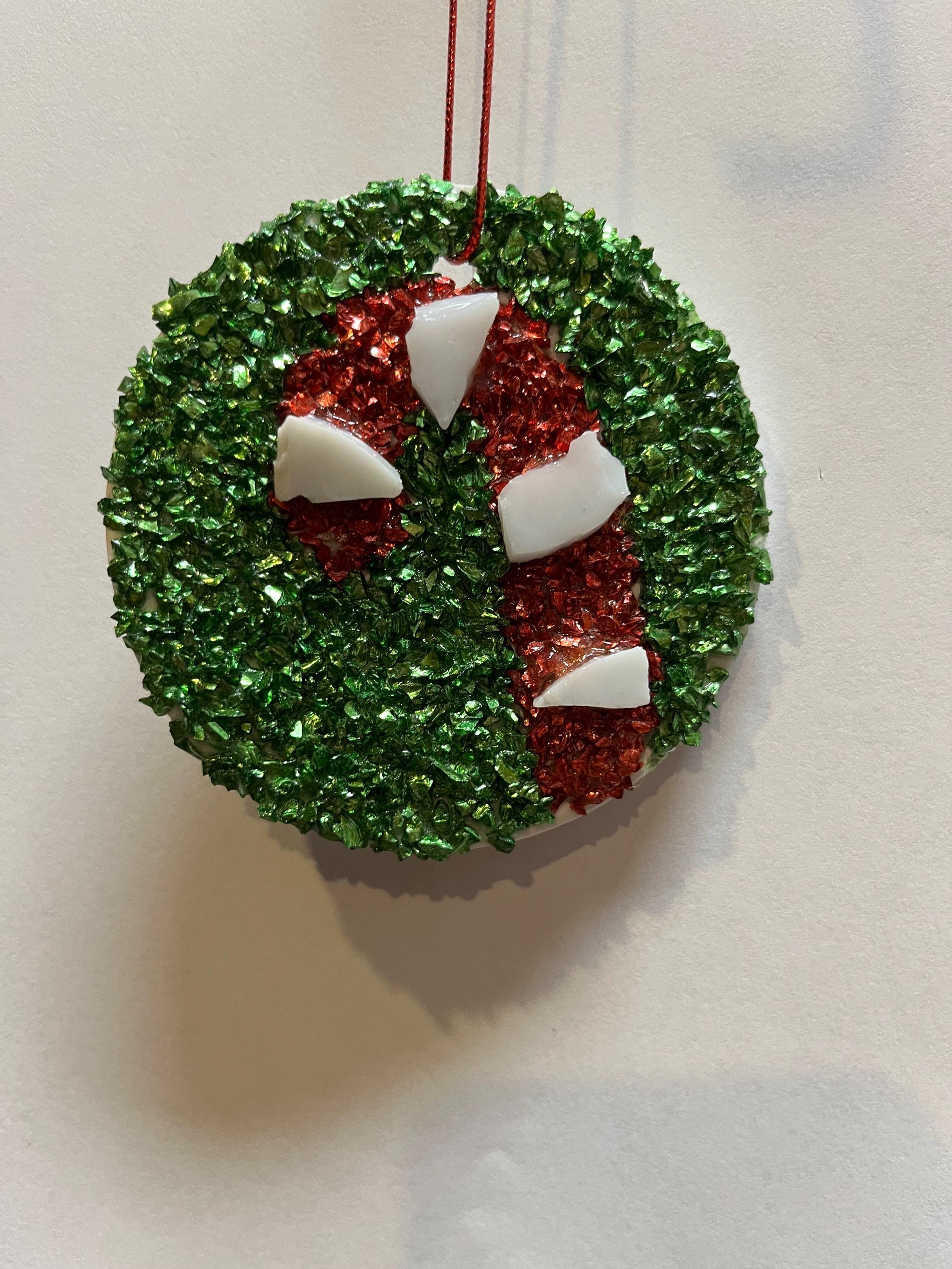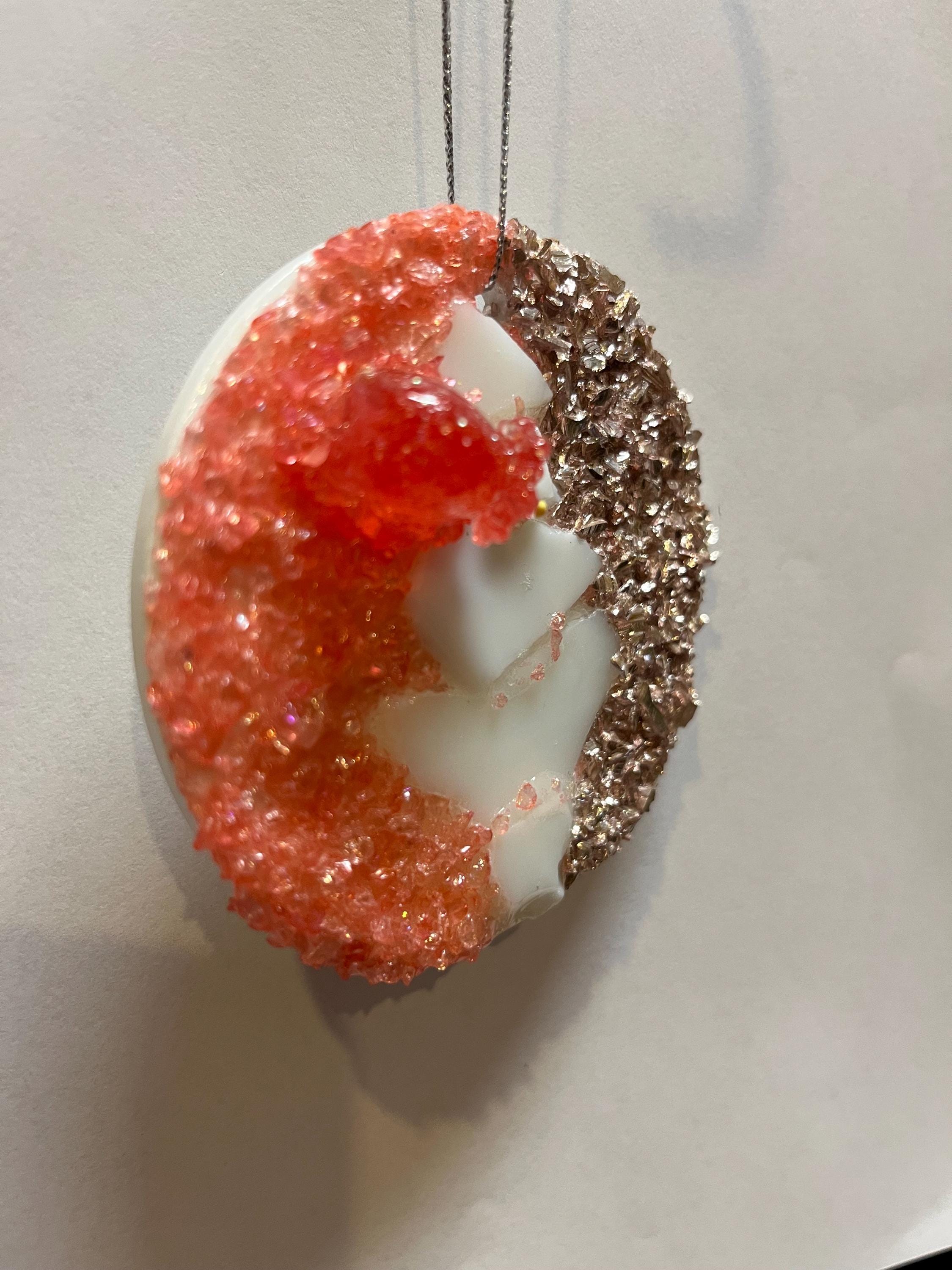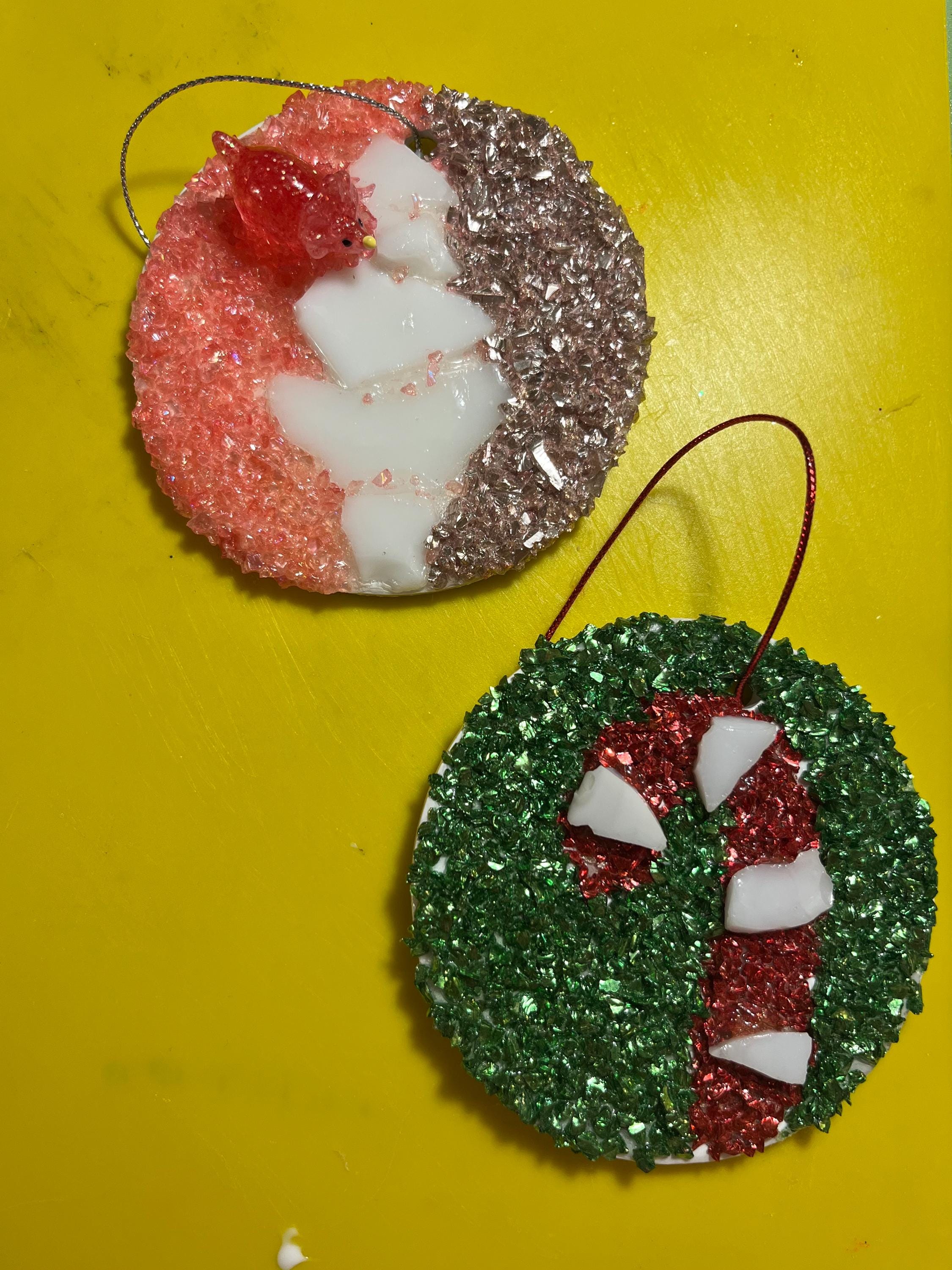 Base is ceramic and adorned with glitter glass, and/or stained glass pieces.