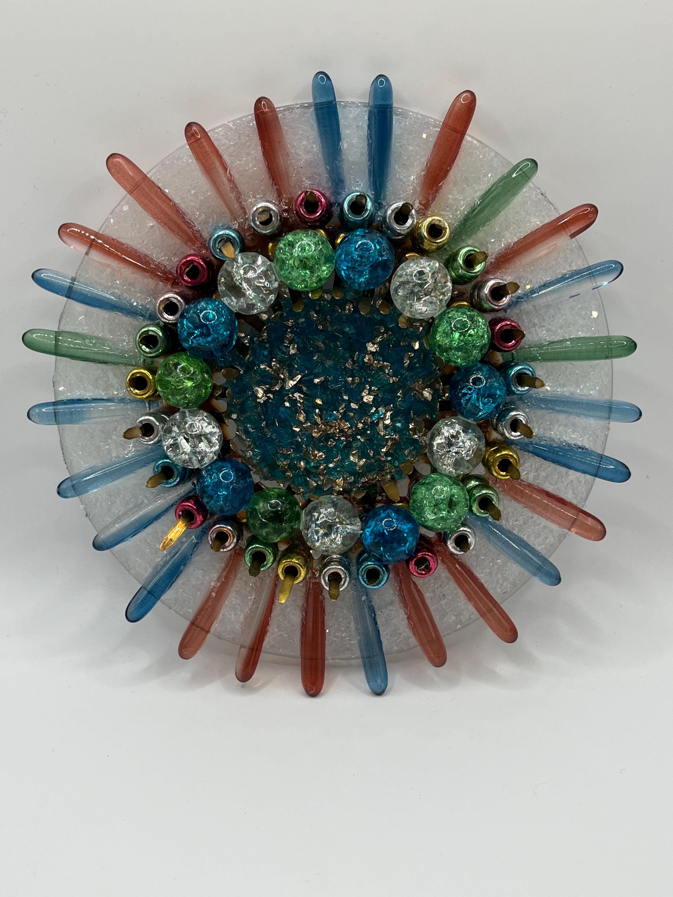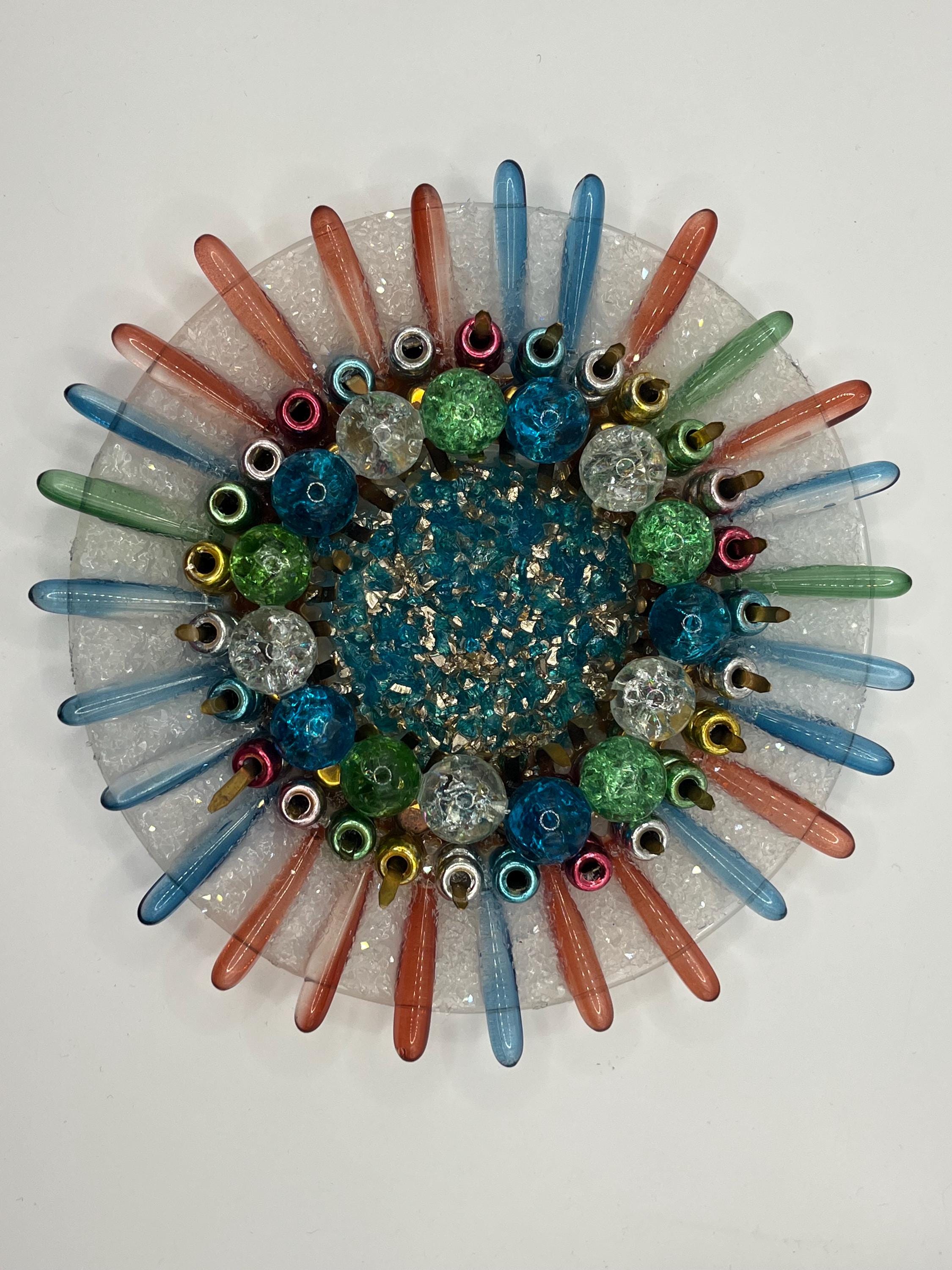 Bring color, light, and ocean-inspired energy into your space with this handcrafted glass sunburst art piece. Each design radiates a mesmerizing mandala pattern made from hand-selected glass beads, metallic accents, and crystal clear glass glitter, creating a truly one-of-a-kind coastal statement piece. The artwork features a dazzling blend of blues, greens, corals, and gold, arranged in a circular burst that captures the shimmer of sunlight on water. The central section glows with crushed glass and gold flakes, while the outer rings showcase textured glass beads and elongated droplets that add dynamic depth and sparkle from every angle.