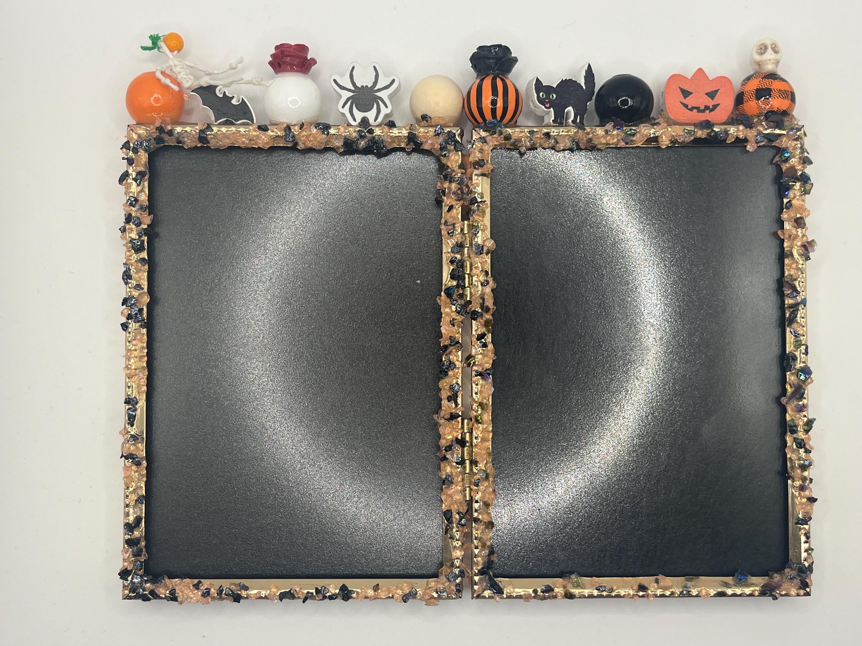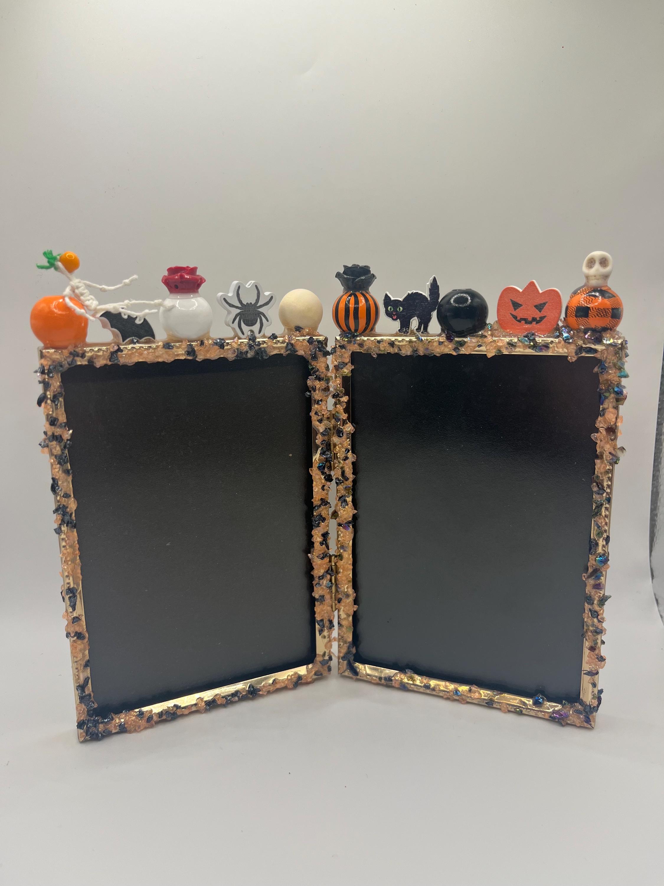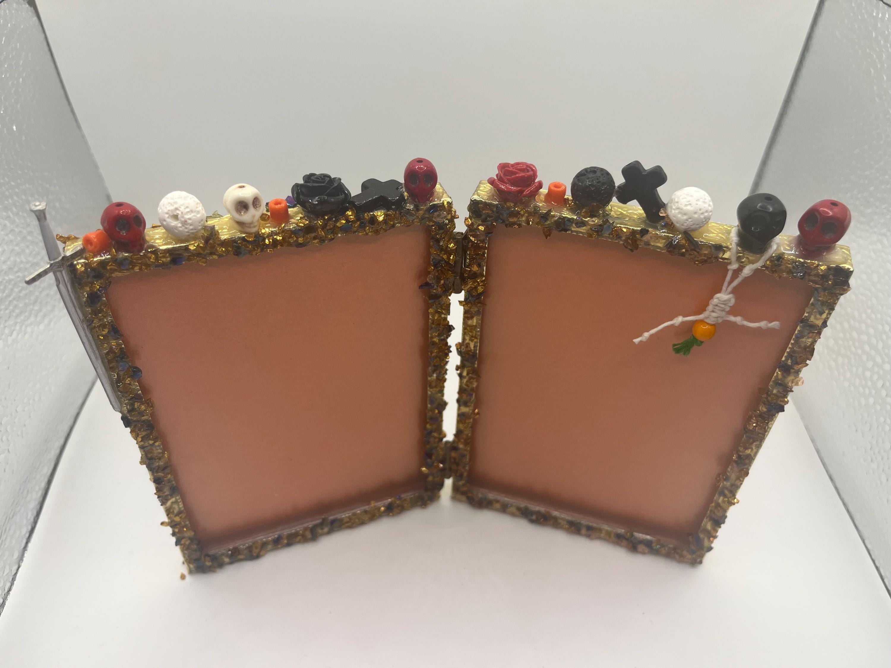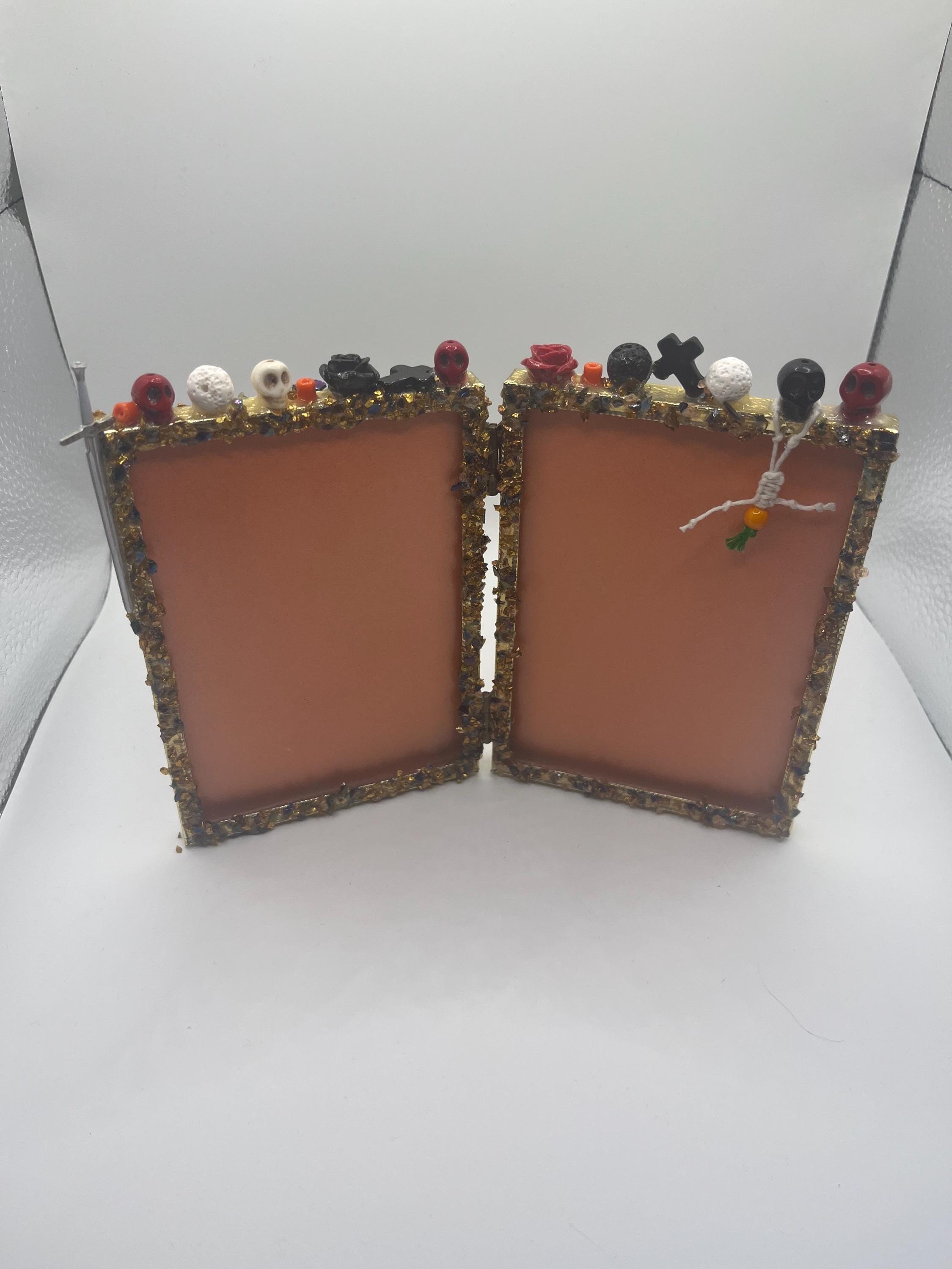 These are double 3x4 picture frames that have been decorated with fun! Great gift for anyone. An immediate smile comes with them! Made from crushed glass glitter, macrame skeleton and figurines.