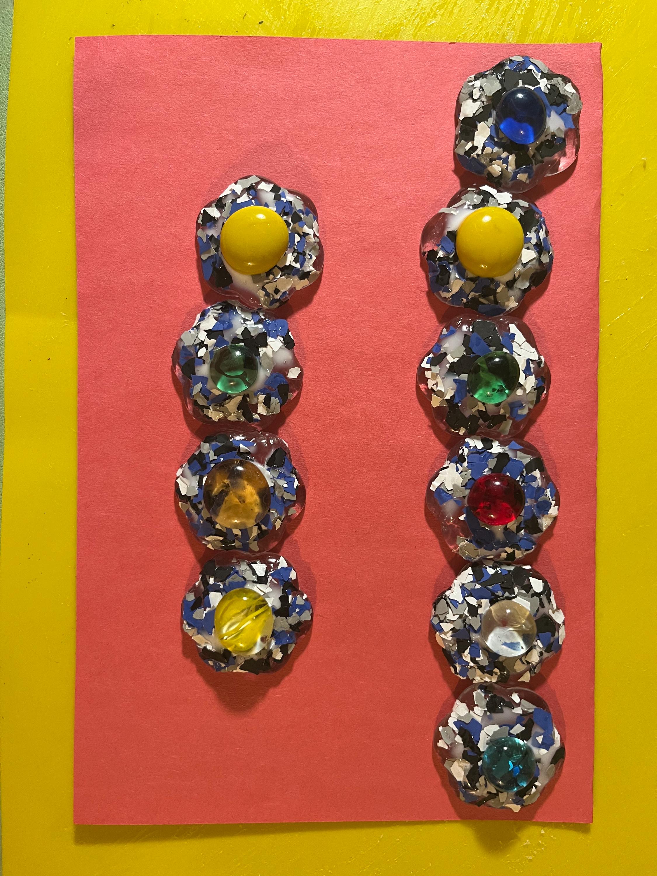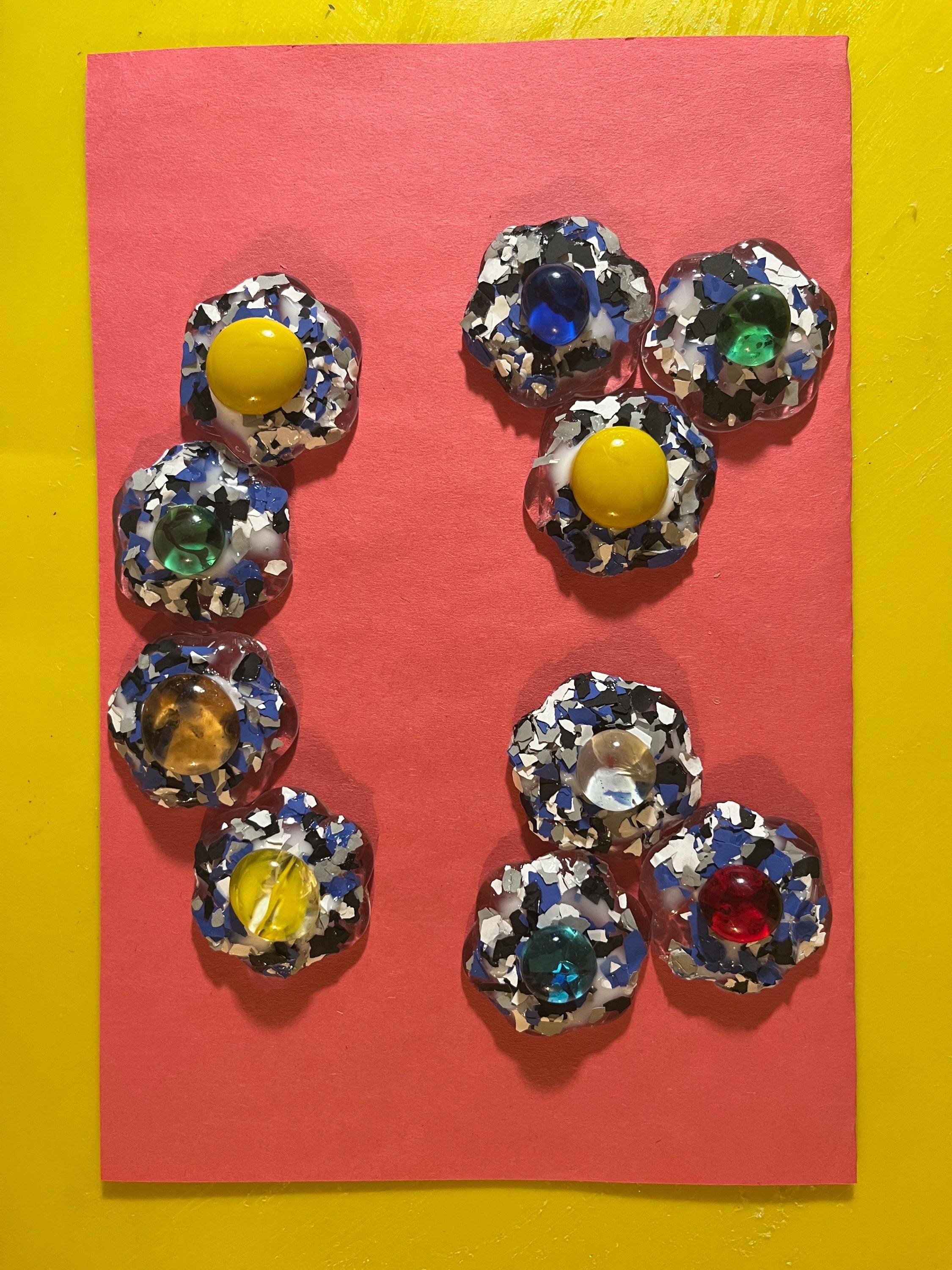 Whimsical magnet adorned with colorful glass bead and blue and black paint chips.