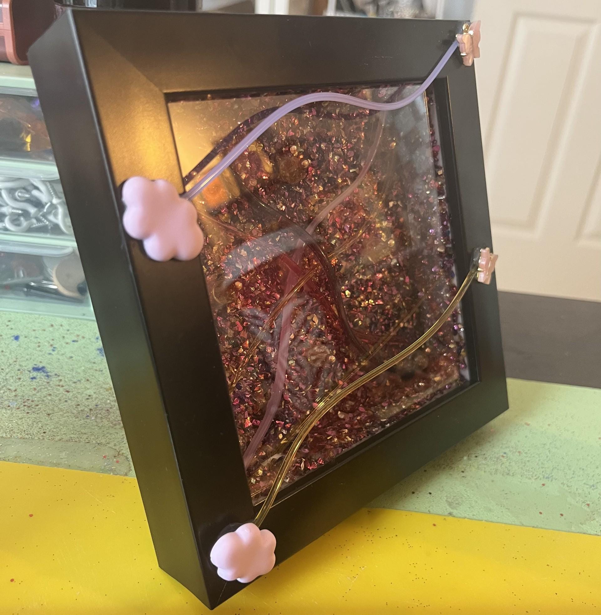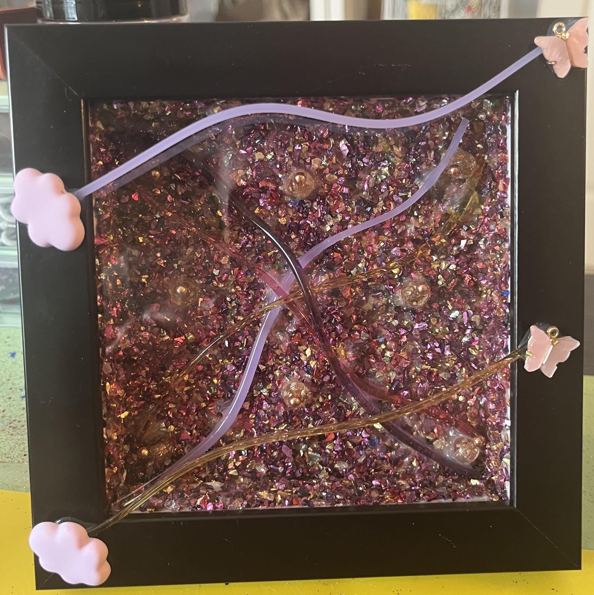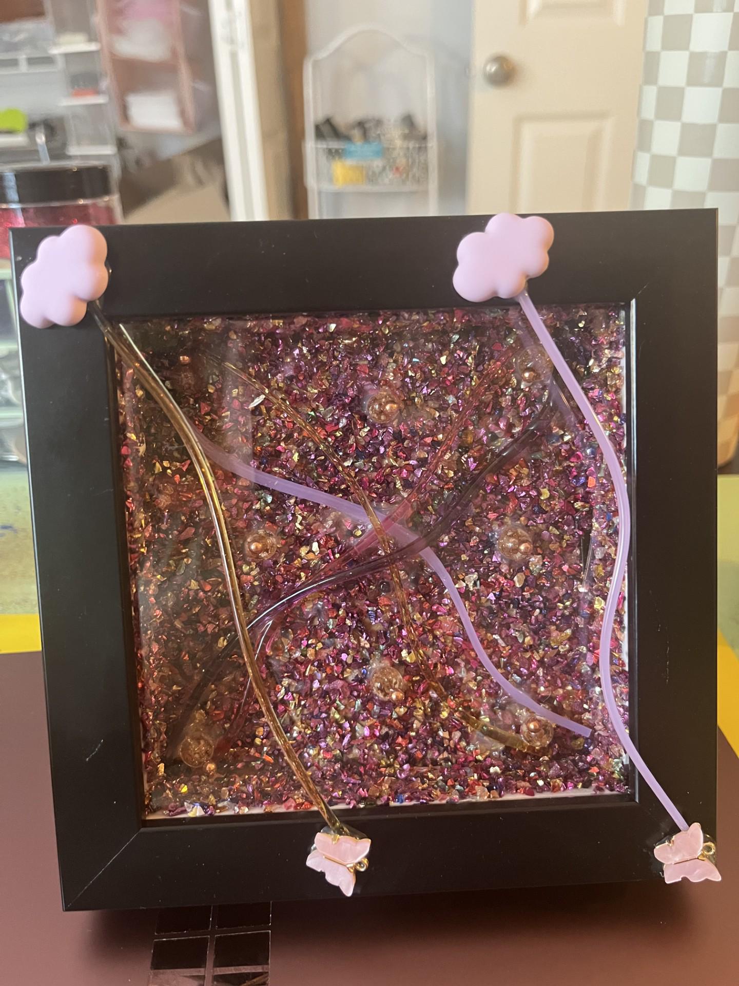 Add a touch of magic and shimmer to your space with this one-of-a-kind handmade mixed media art piece. Set in a sleek black frame, this artwork features a richly textured background of crushed purple crystal-like fragments that catch the light beautifully, creating depth, sparkle, and movement from every angle.