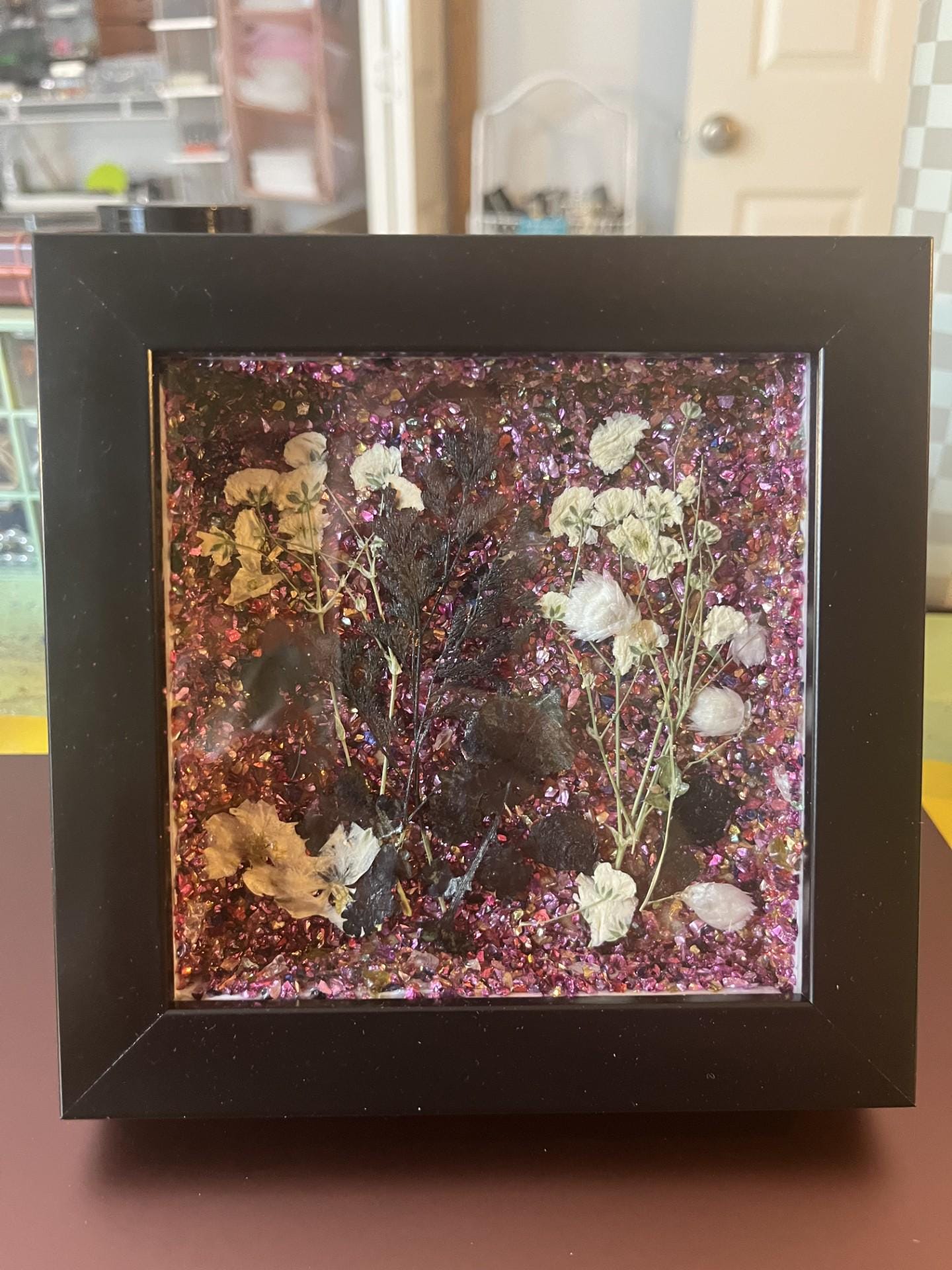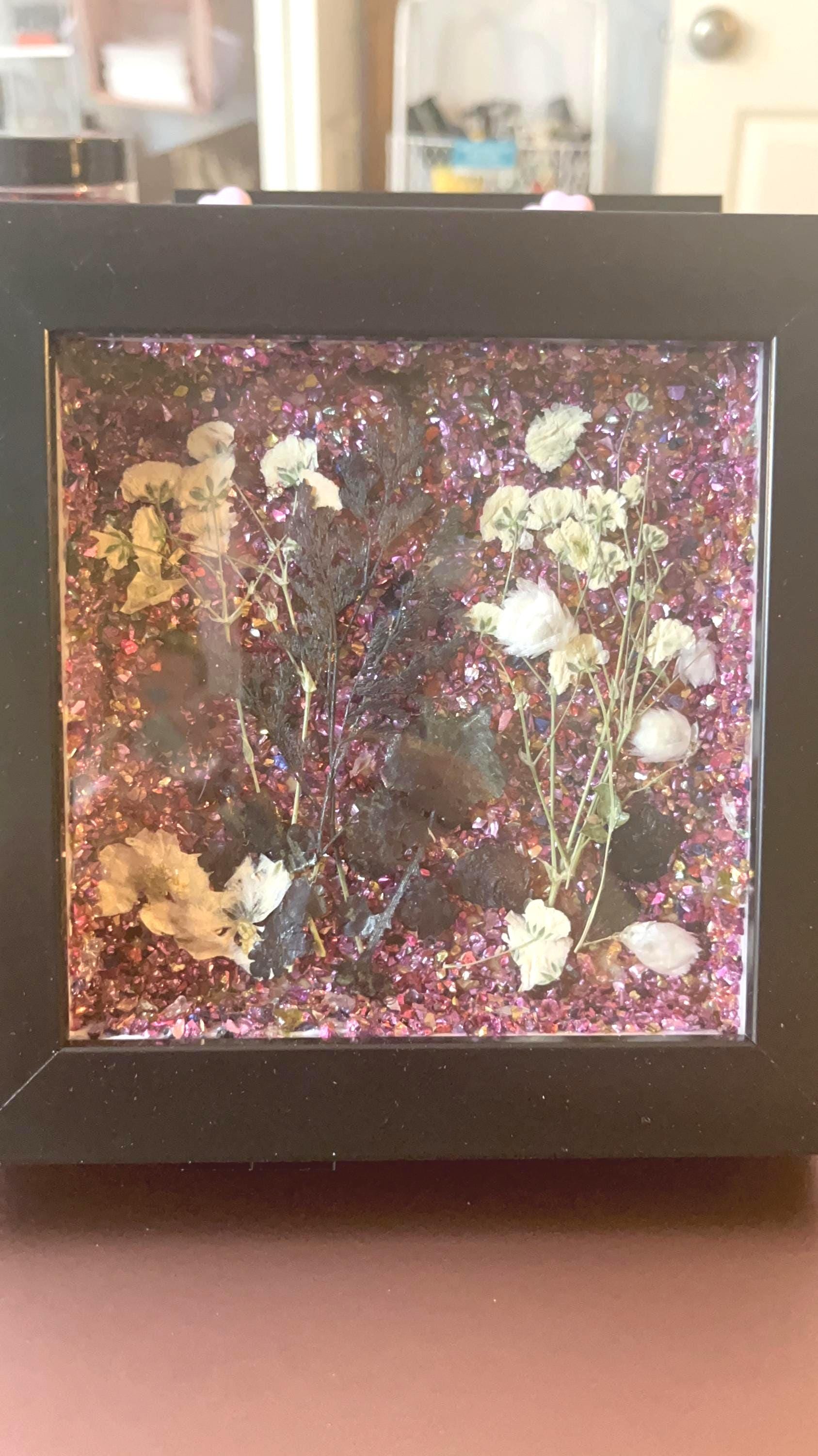 Add a touch of magic and shimmer to your space with this one-of-a-kind handmade mixed-media art piece, featuring dried black flowers as the primary subject. Set in a sleek black frame, this artwork features a richly textured background of crushed purple crystal-like fragments that catch the light beautifully, creating depth, sparkle, and movement from every angle.