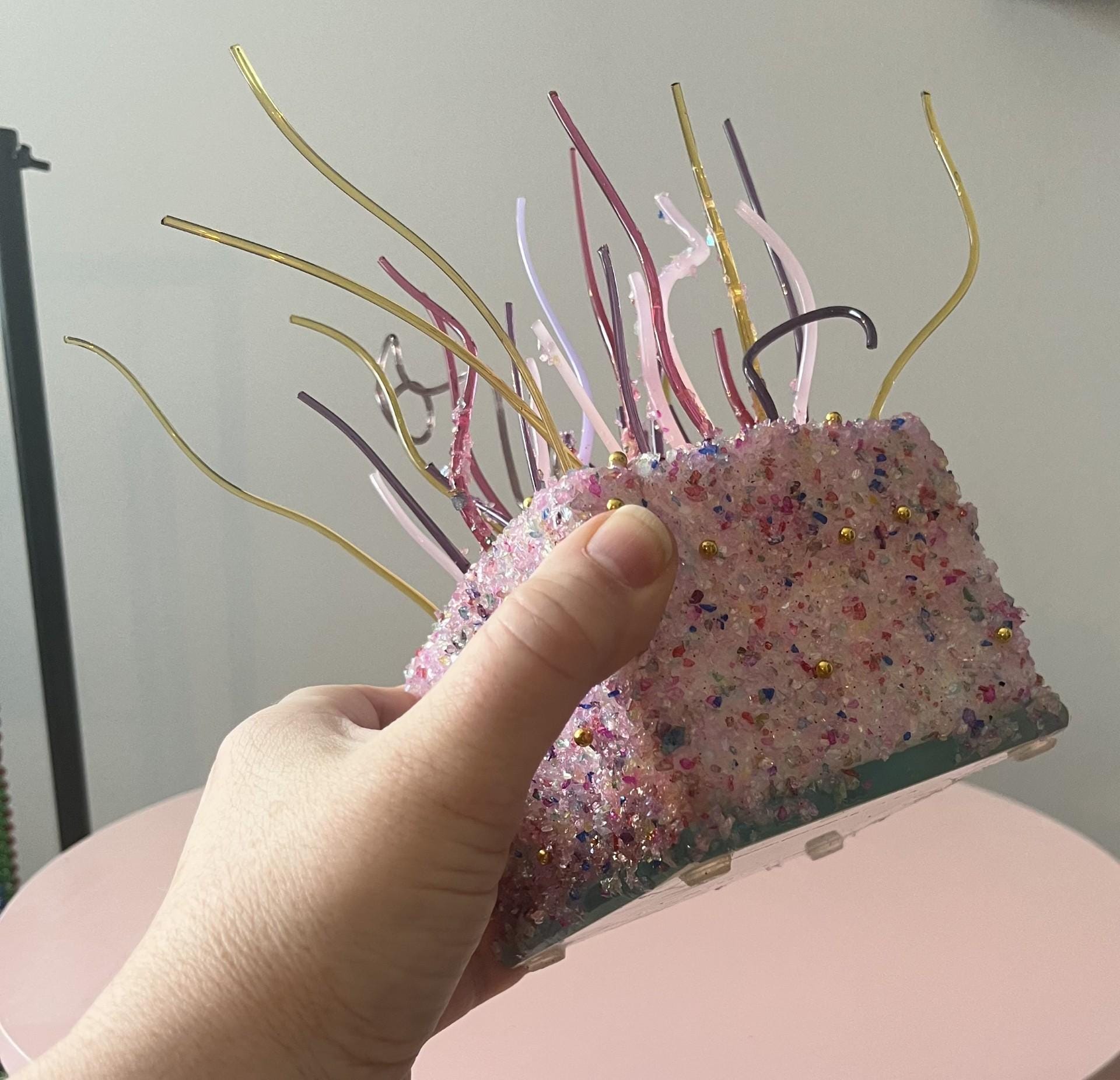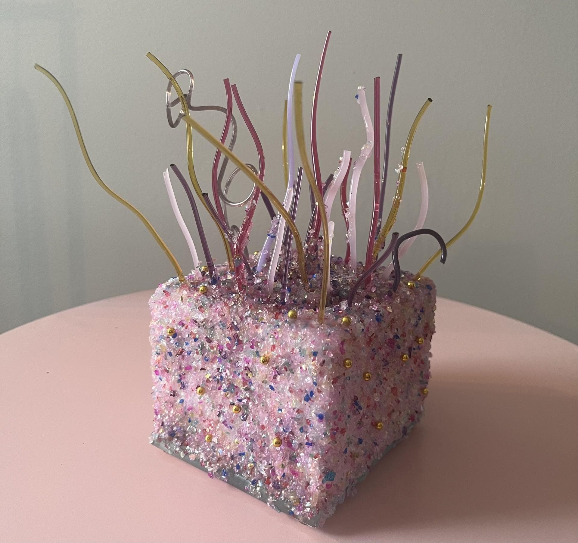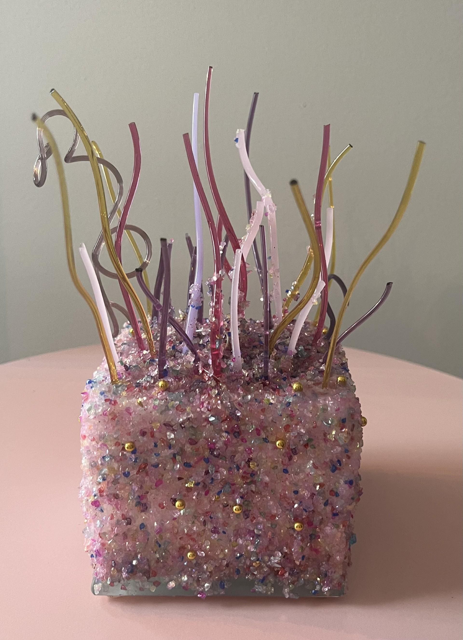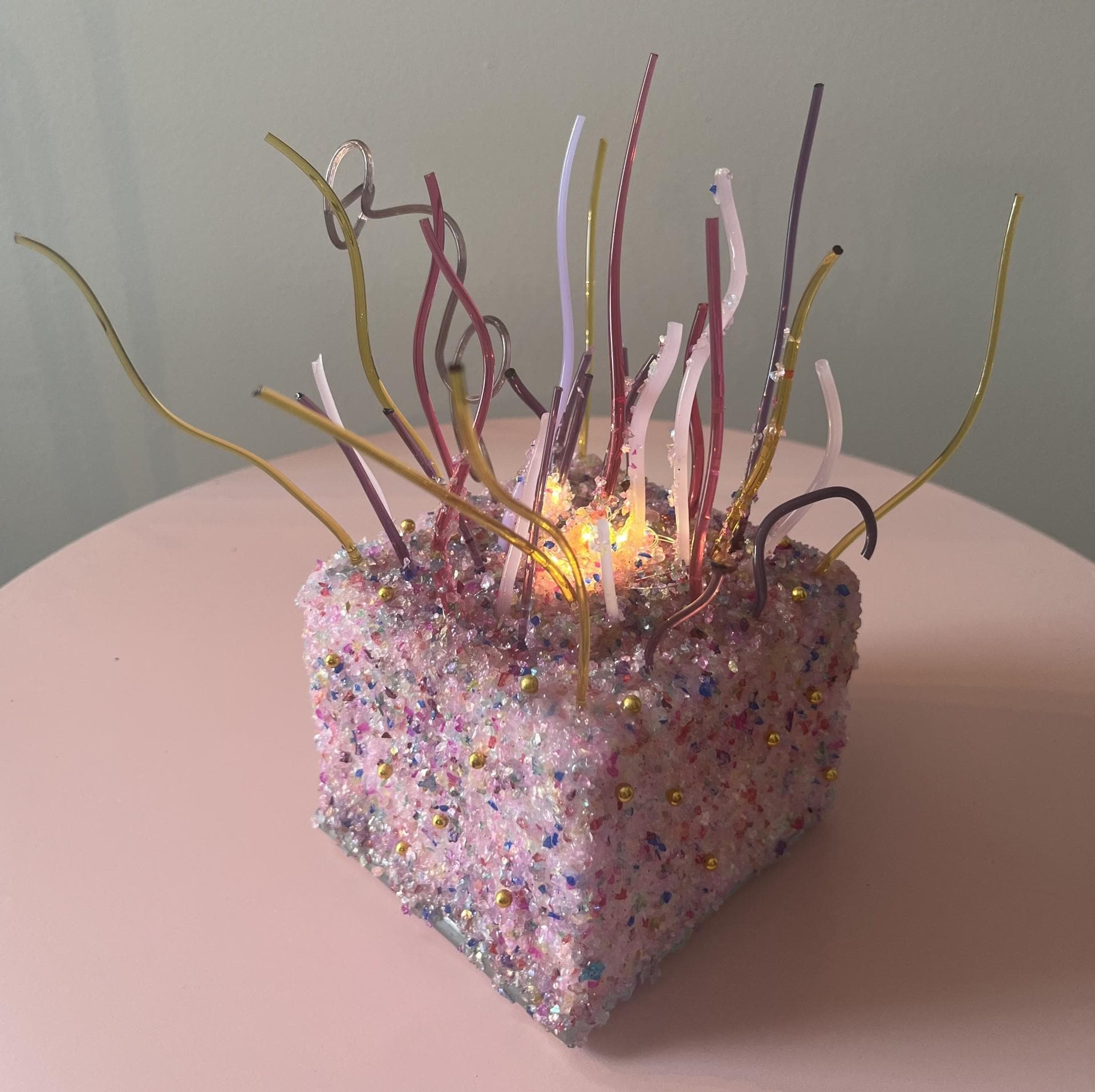 This one-of-a-kind handmade confetti cake light box sparkles with warmth, texture, and love. This has been carefully crafted with a richly textured confetti colored glitter base and adorned with assorted colors of fused glass pieces and fairy lights. Tiny gold accents adorn the sides of the cake.