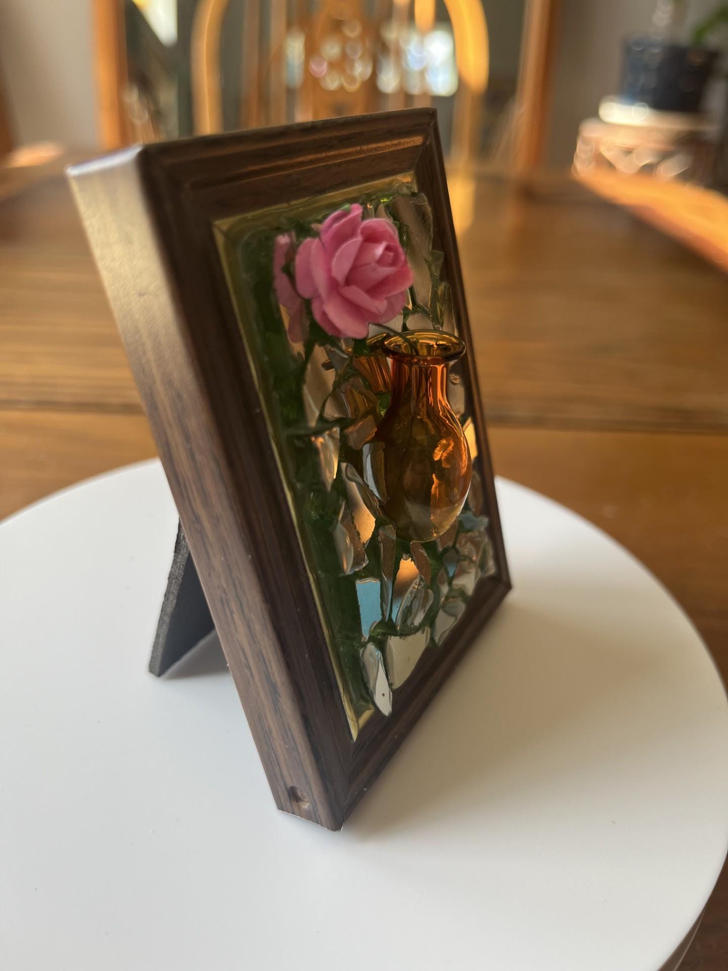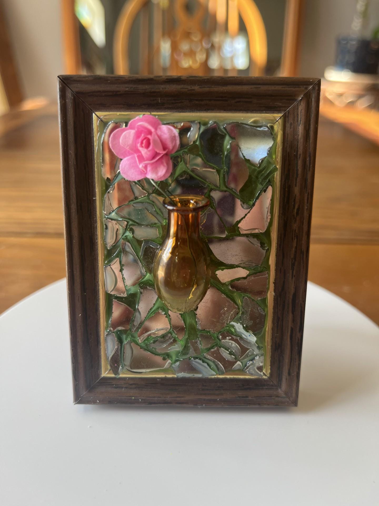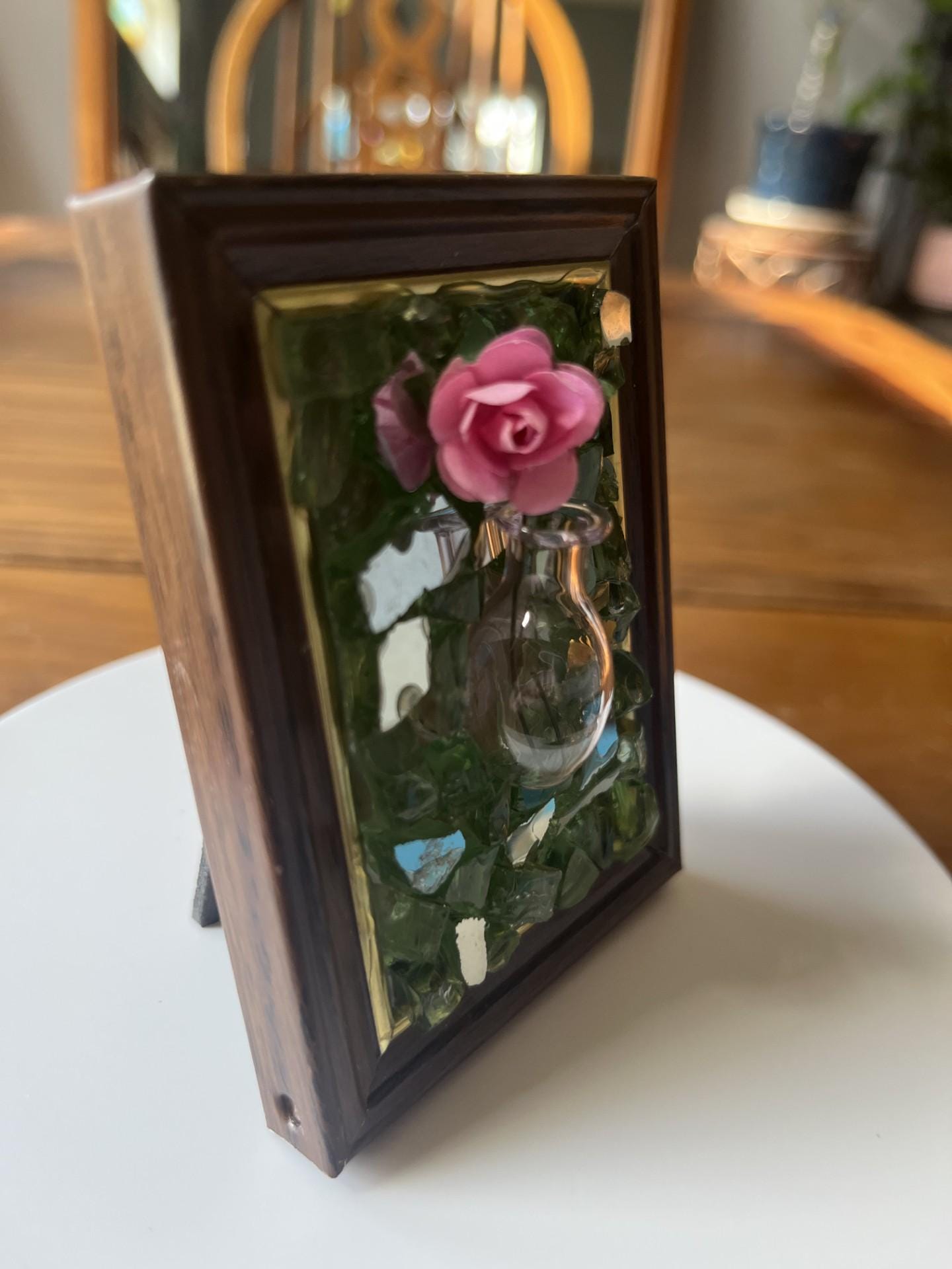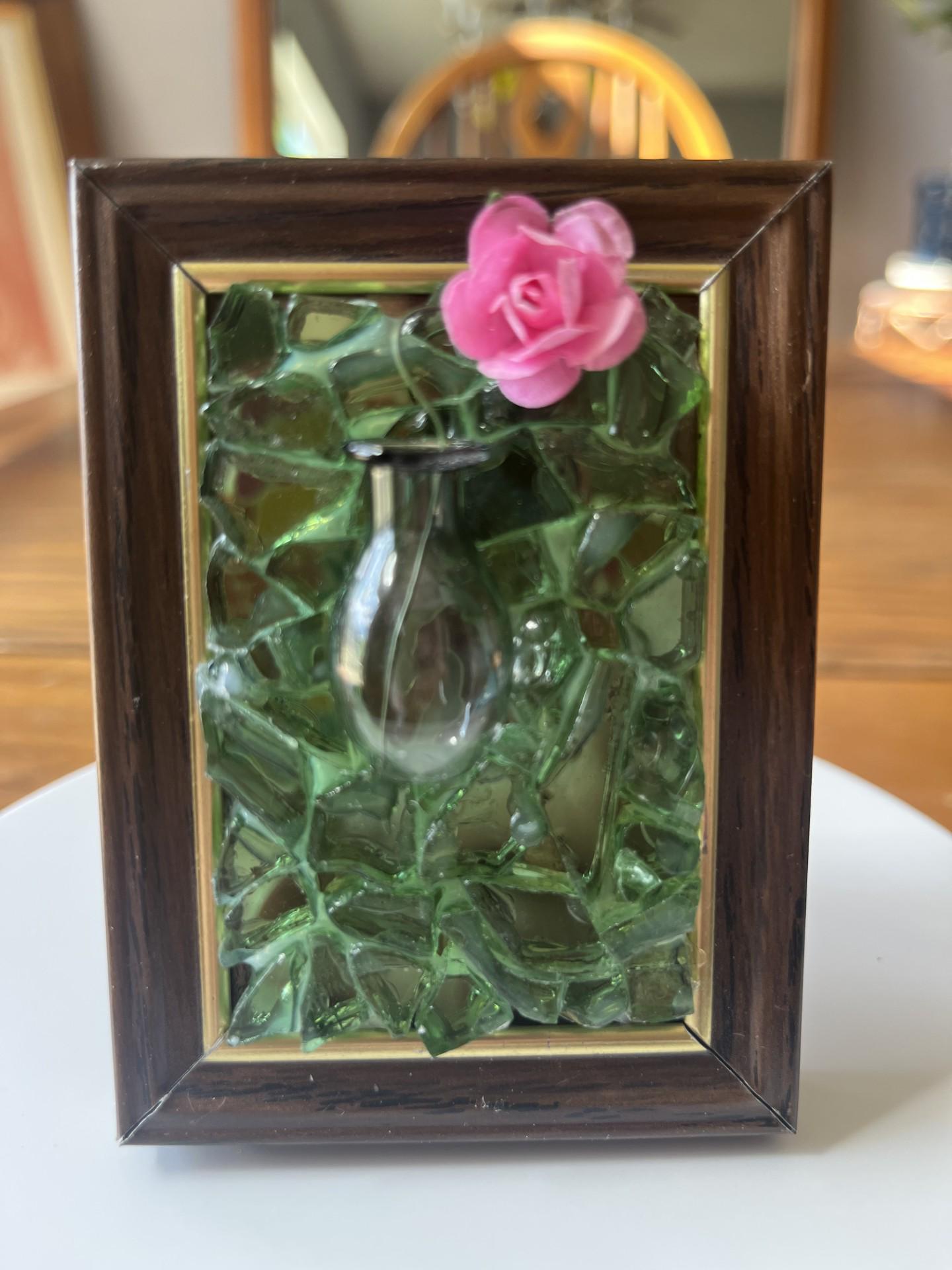 Repurposed frame with whimsy and an added mini vase for a mini flower.