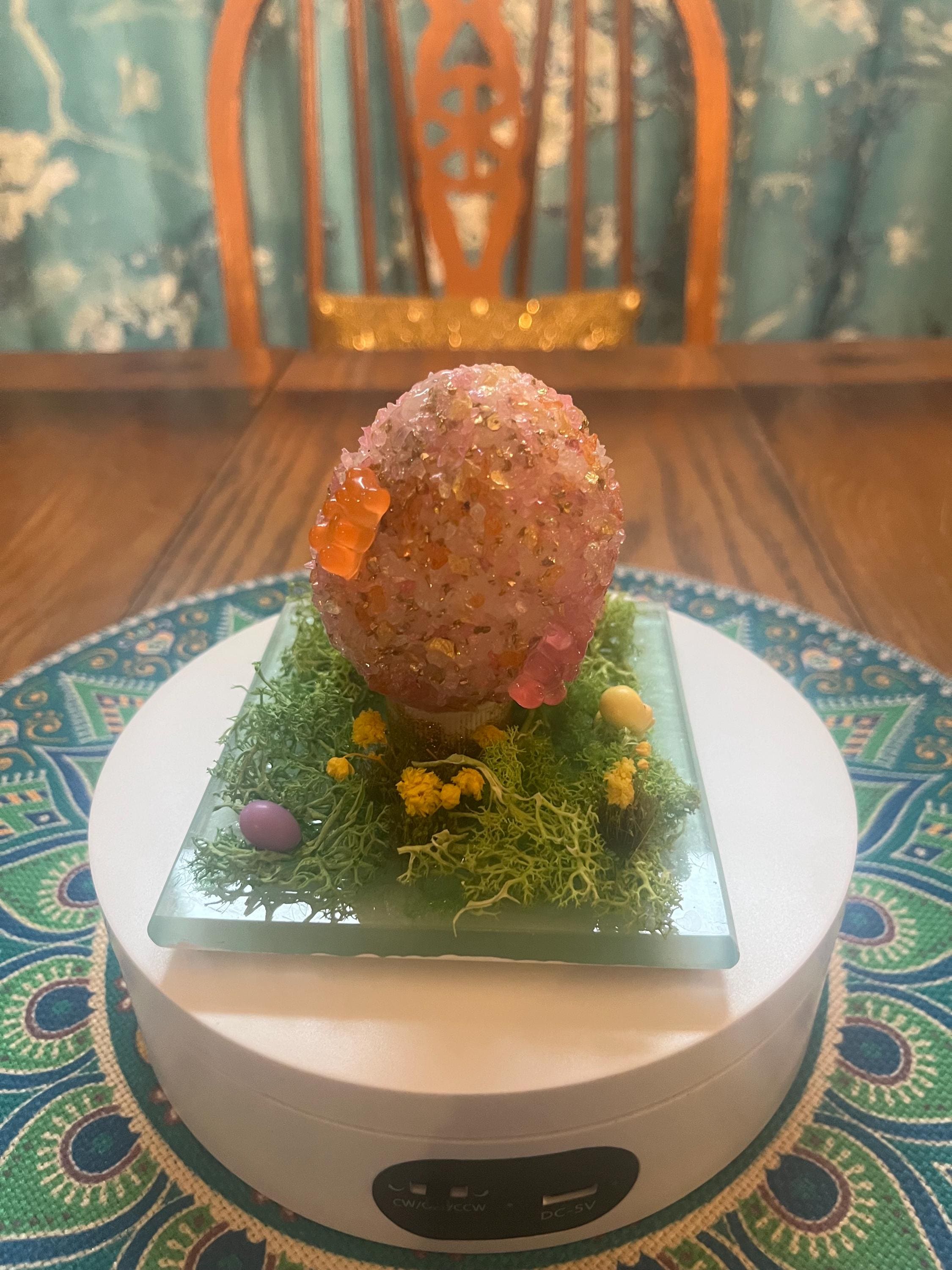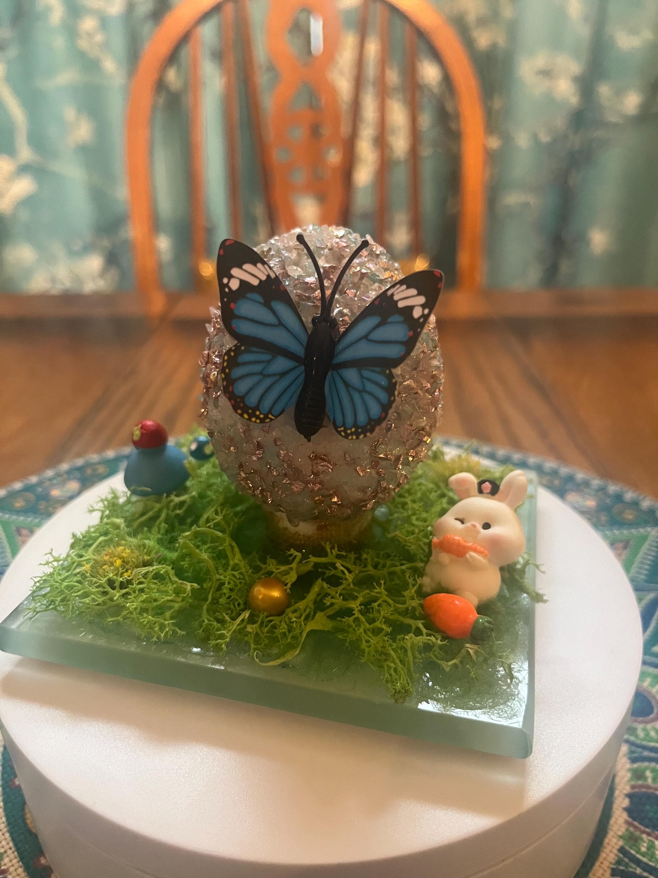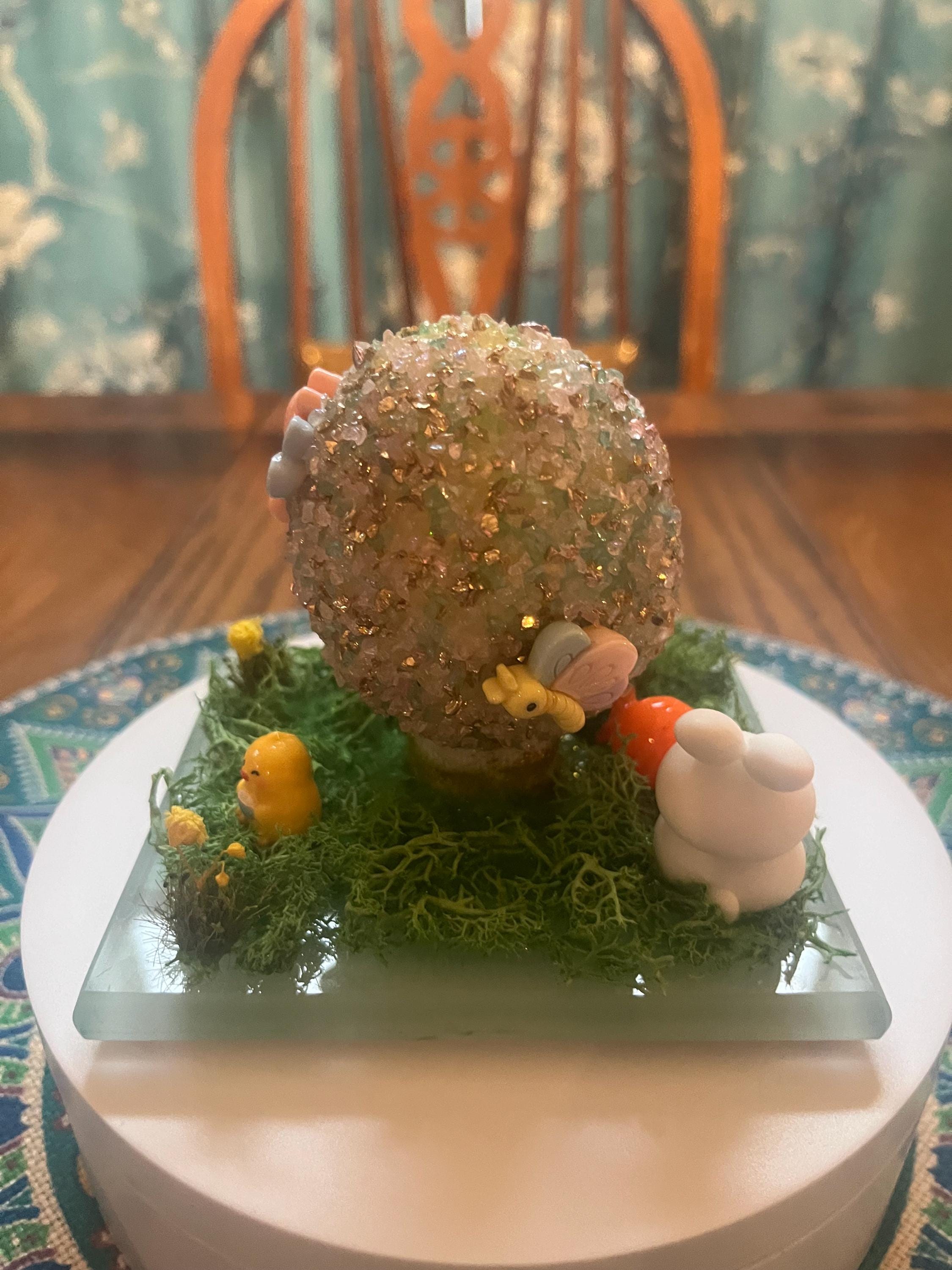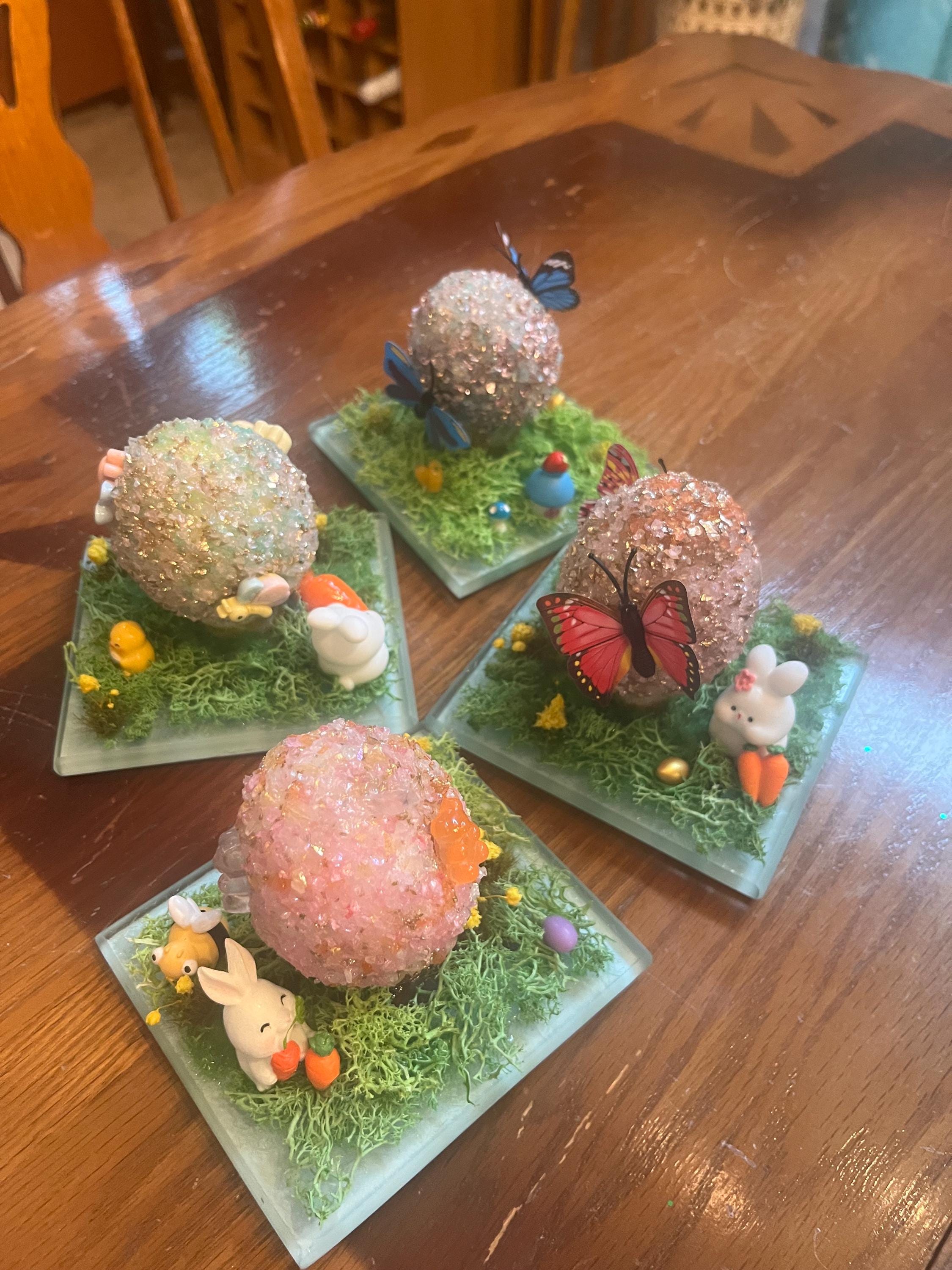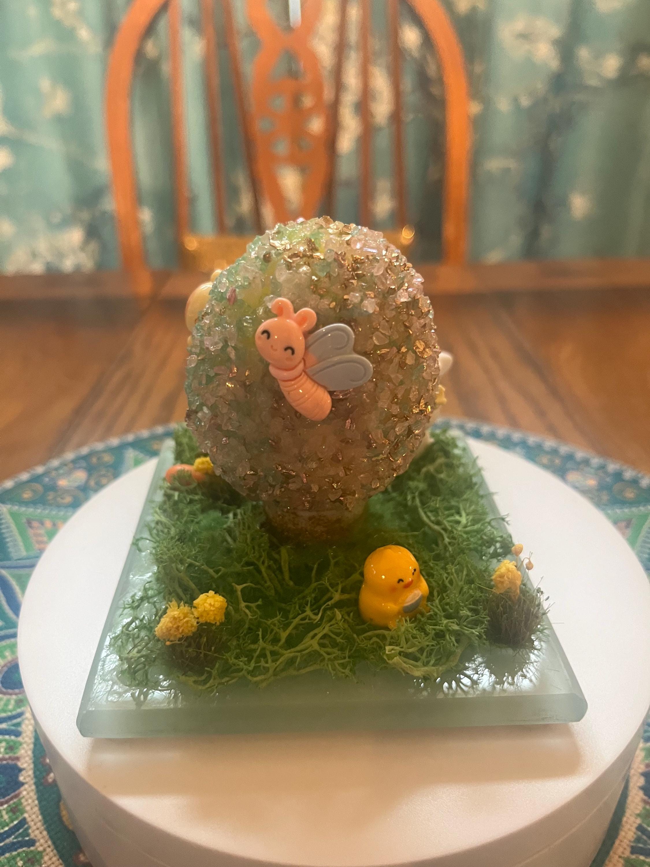 Repurposed glass coaster serves as the foundation for a small Easter/spring science. Egg is made from styrofoam and glass glitter as well as a variety of Easter/spring inspired push pins and resin miniatures. Fun for everyone.
