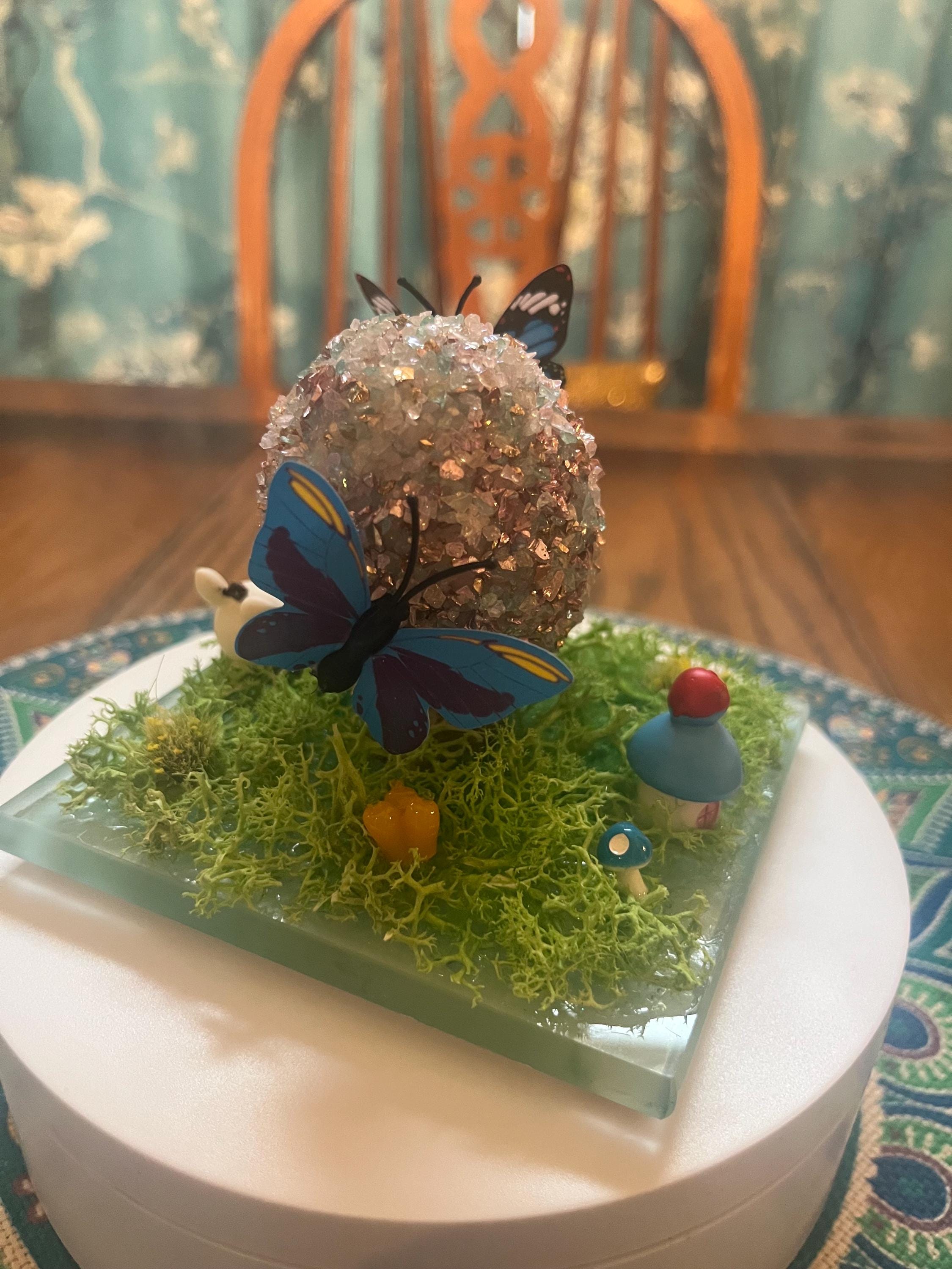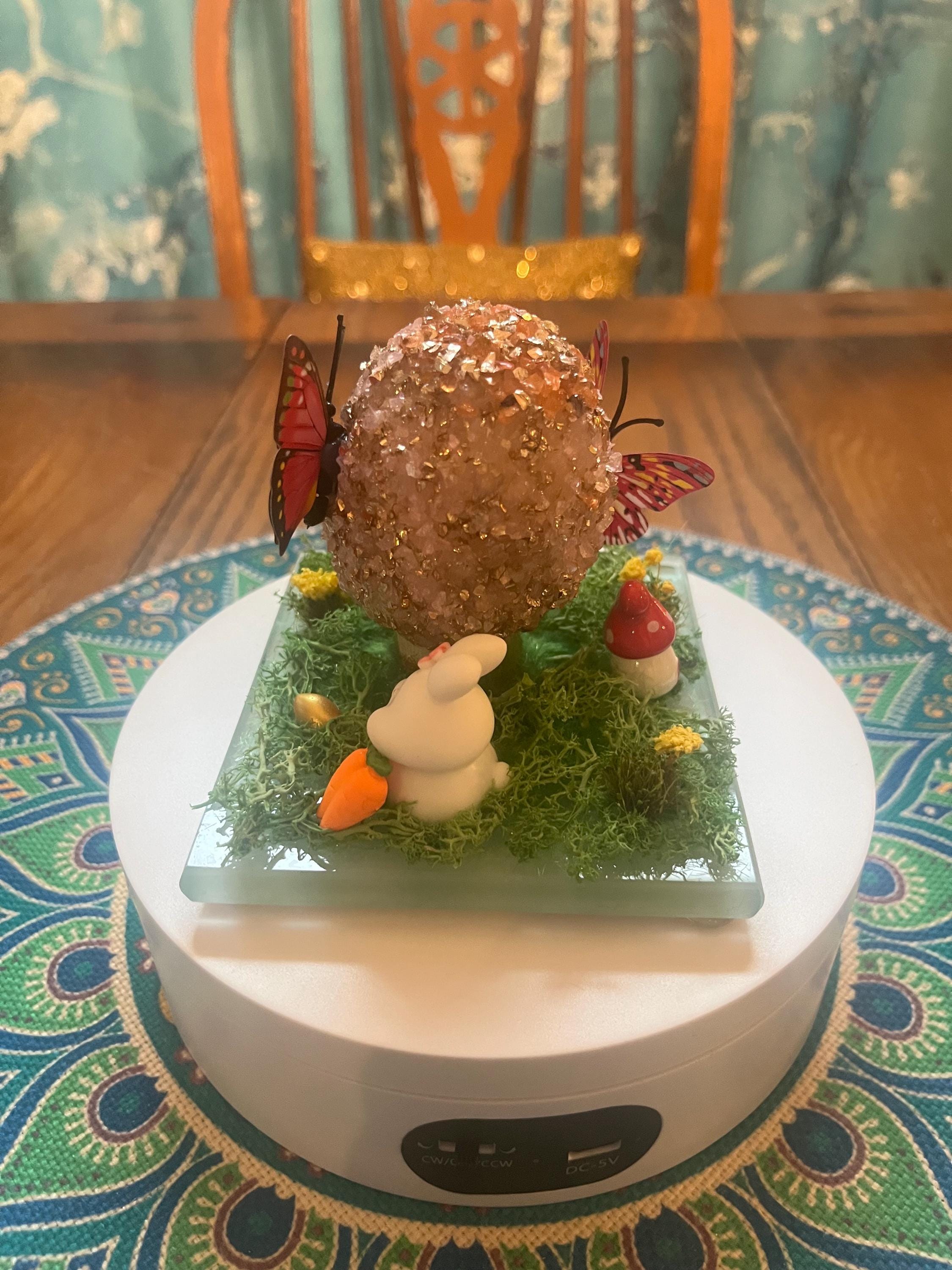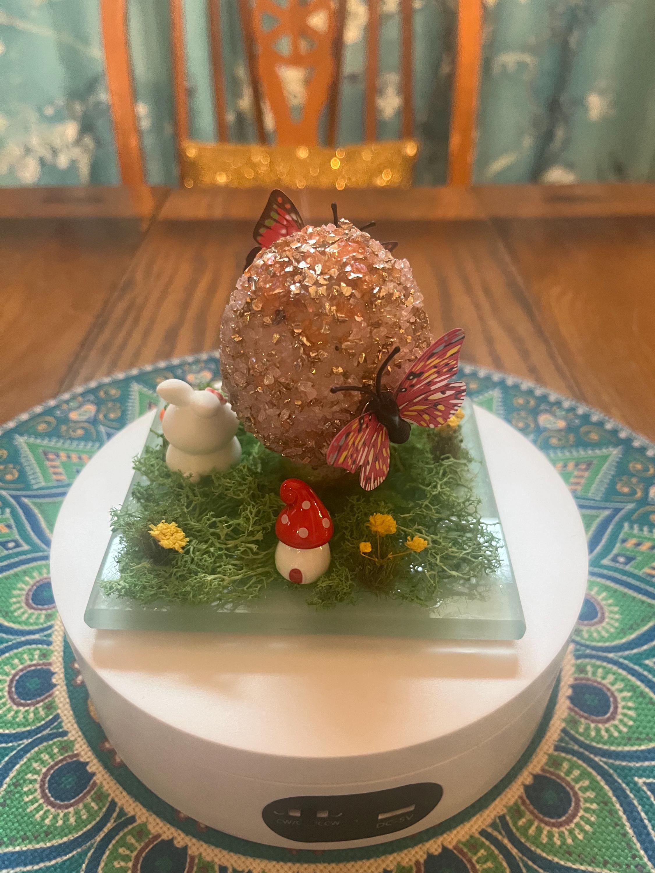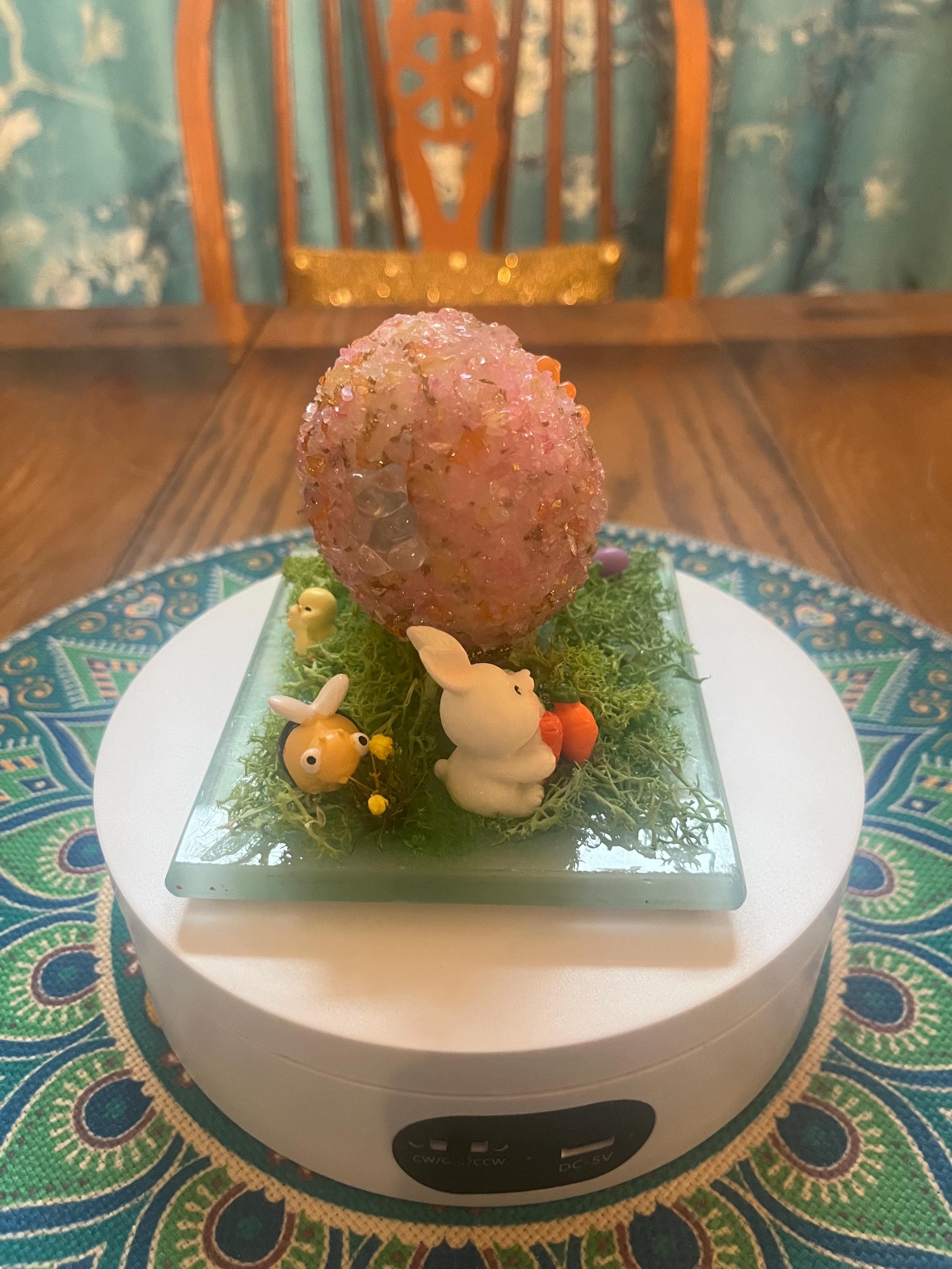 Repurposed glass coaster serves as the foundation for a small Easter/spring science. Egg is made from styrofoam and glass glitter as well as a variety of Easter/spring inspired push pins and resin miniatures. Fun for everyone.