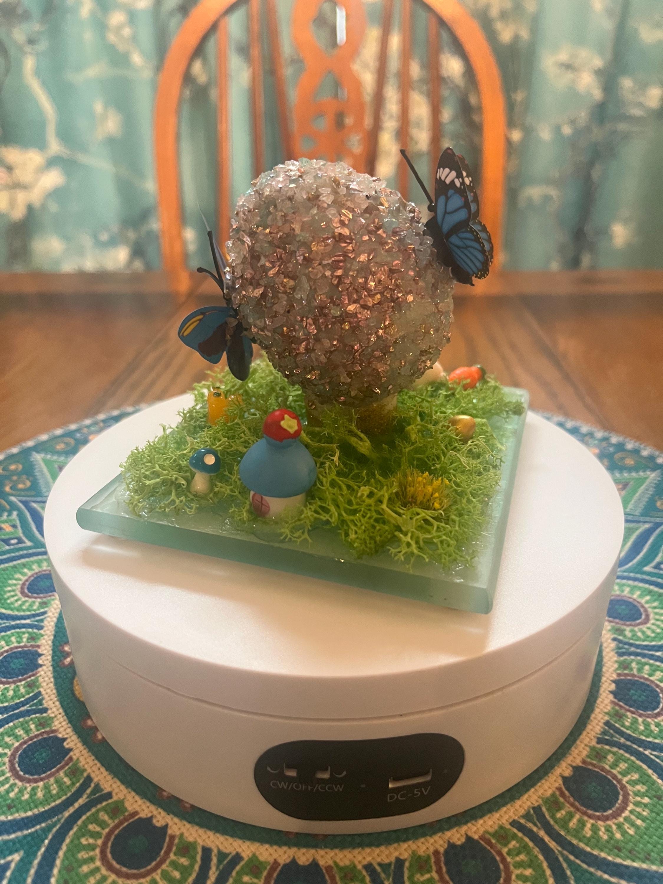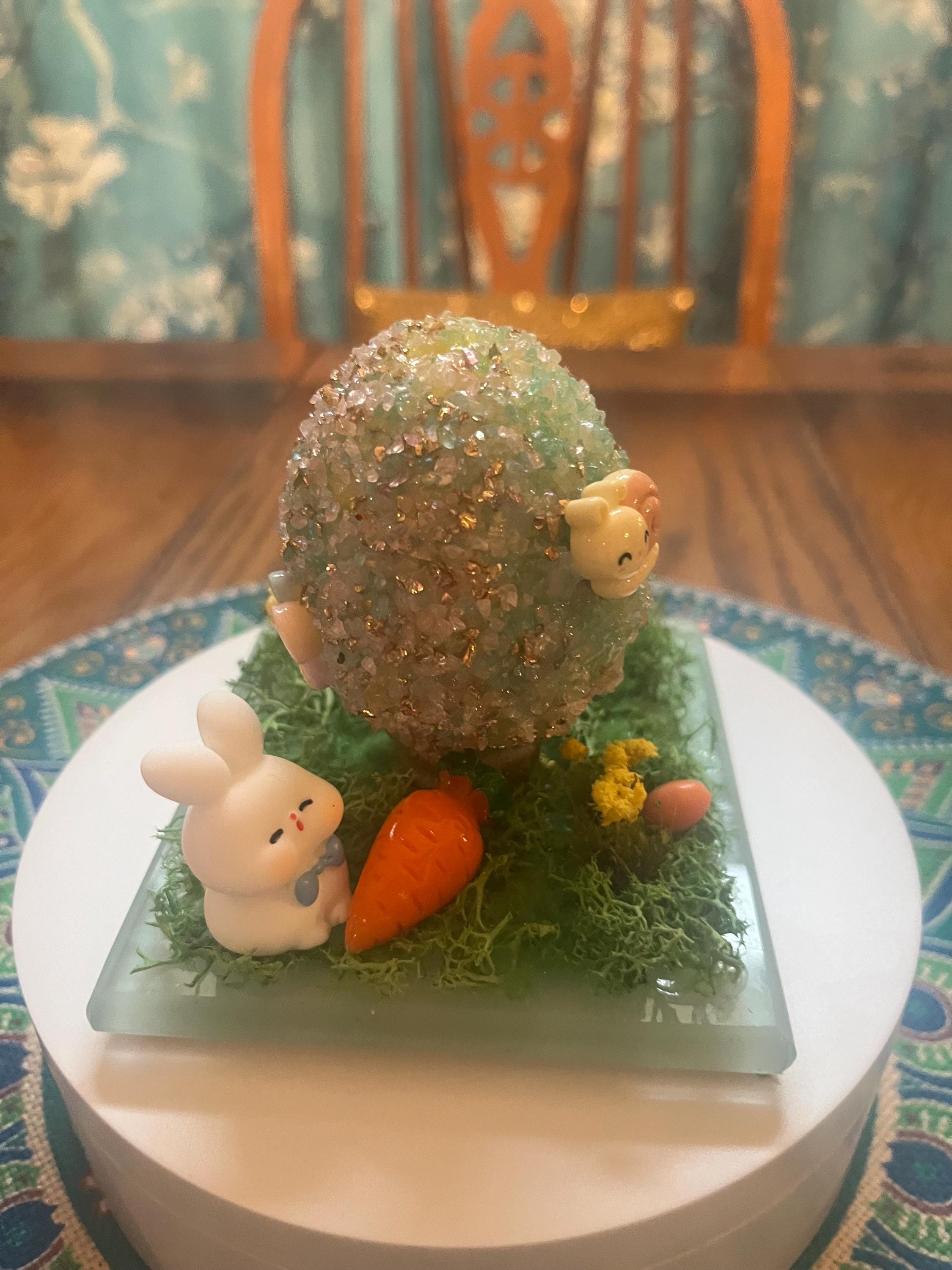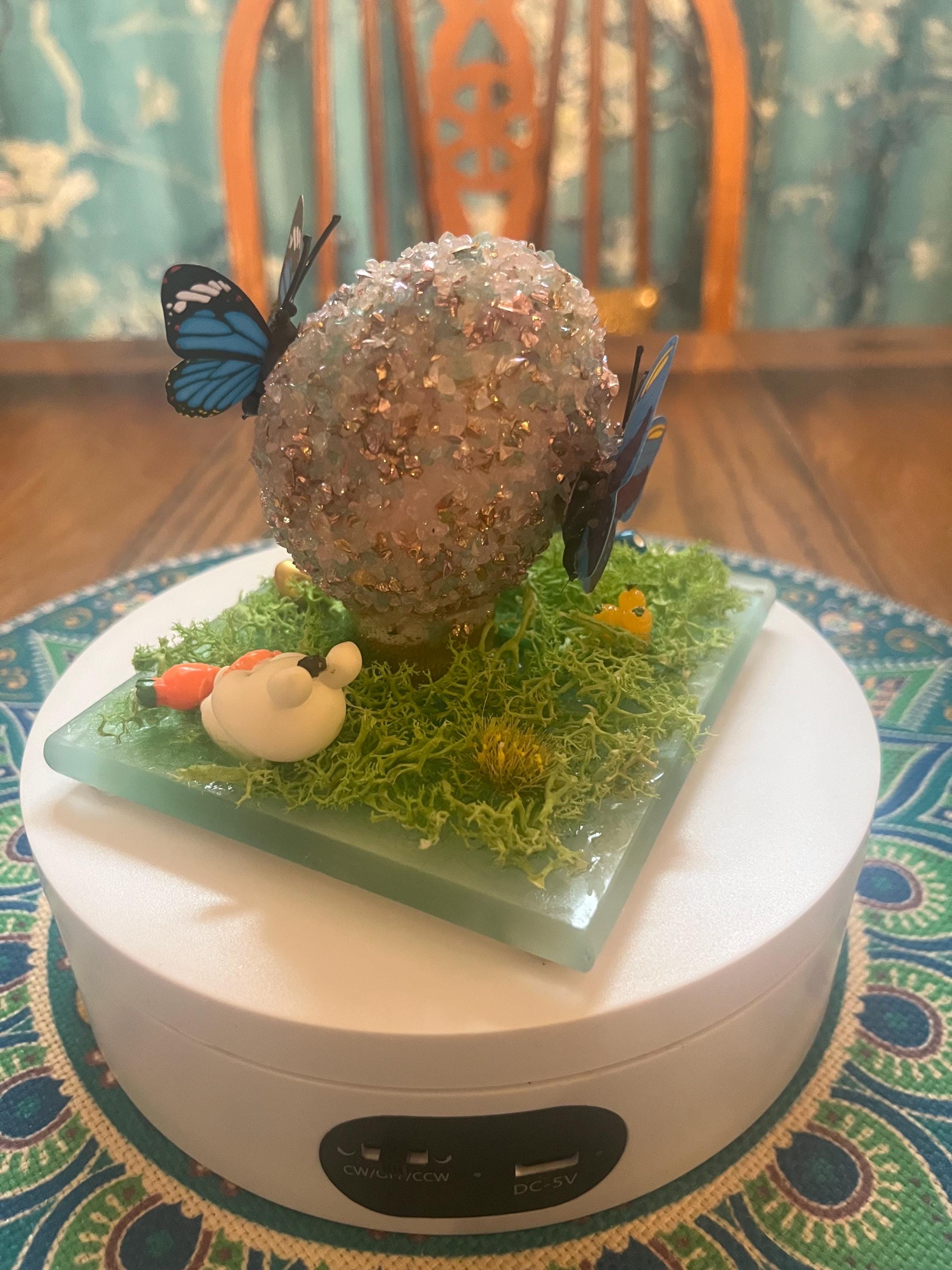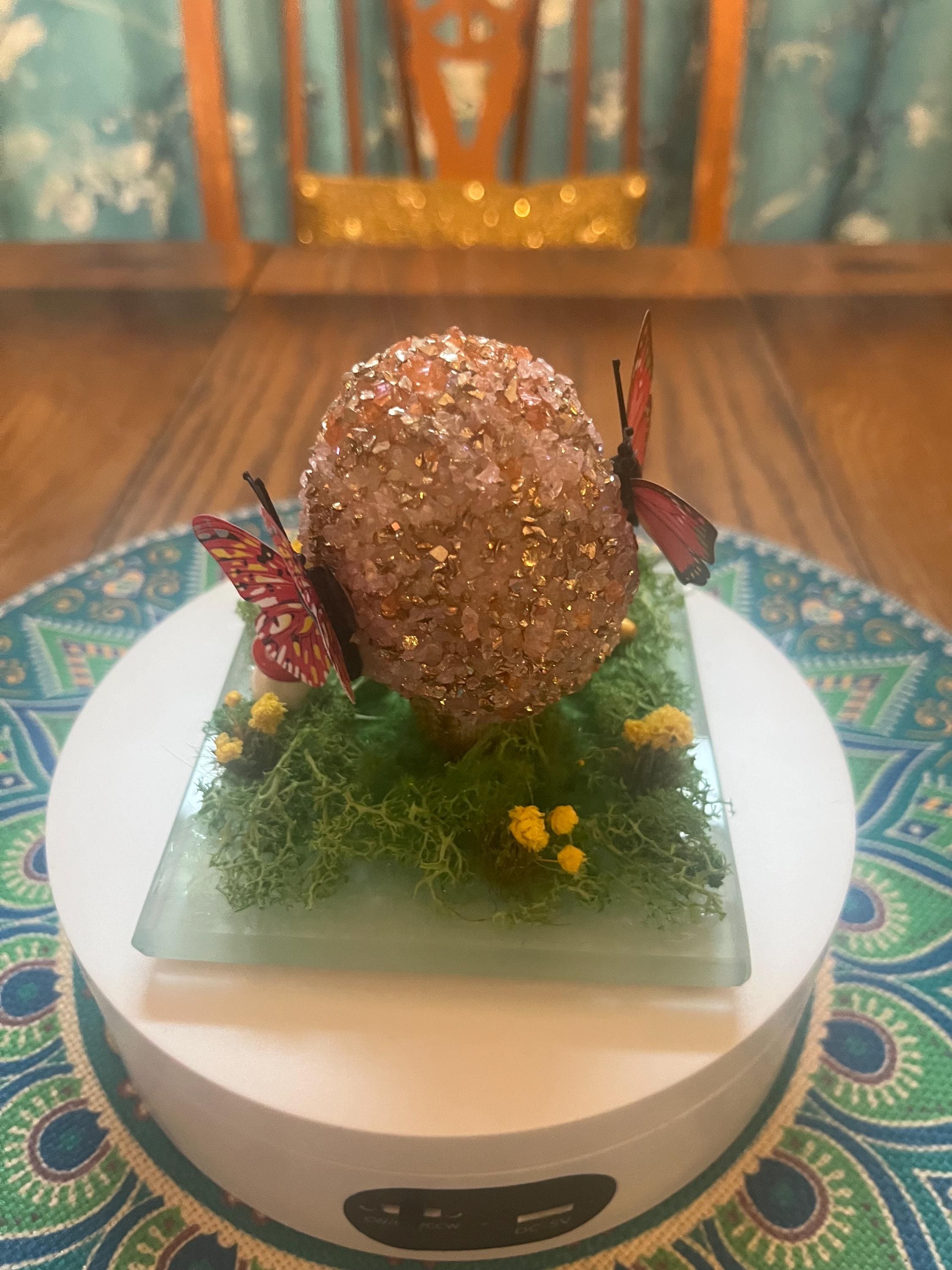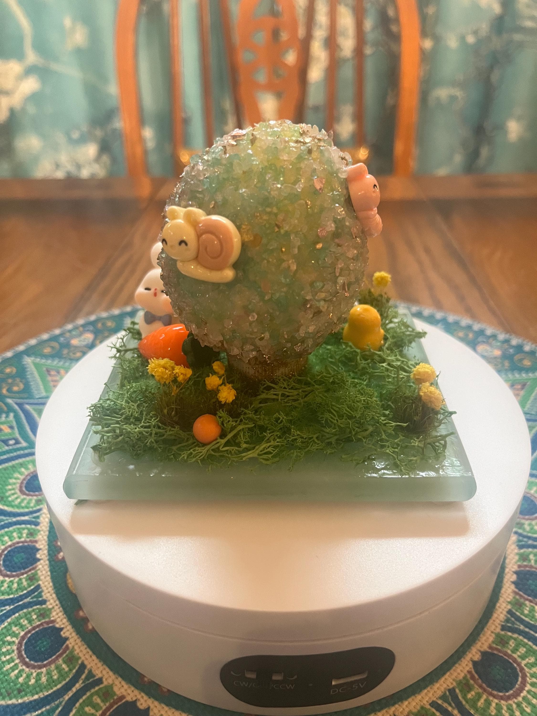 Repurposed glass coaster serves as the foundation for a small Easter/spring science. Egg is made from styrofoam and glass glitter as well as a variety of Easter/spring inspired push pins and resin miniatures. Fun for everyone.