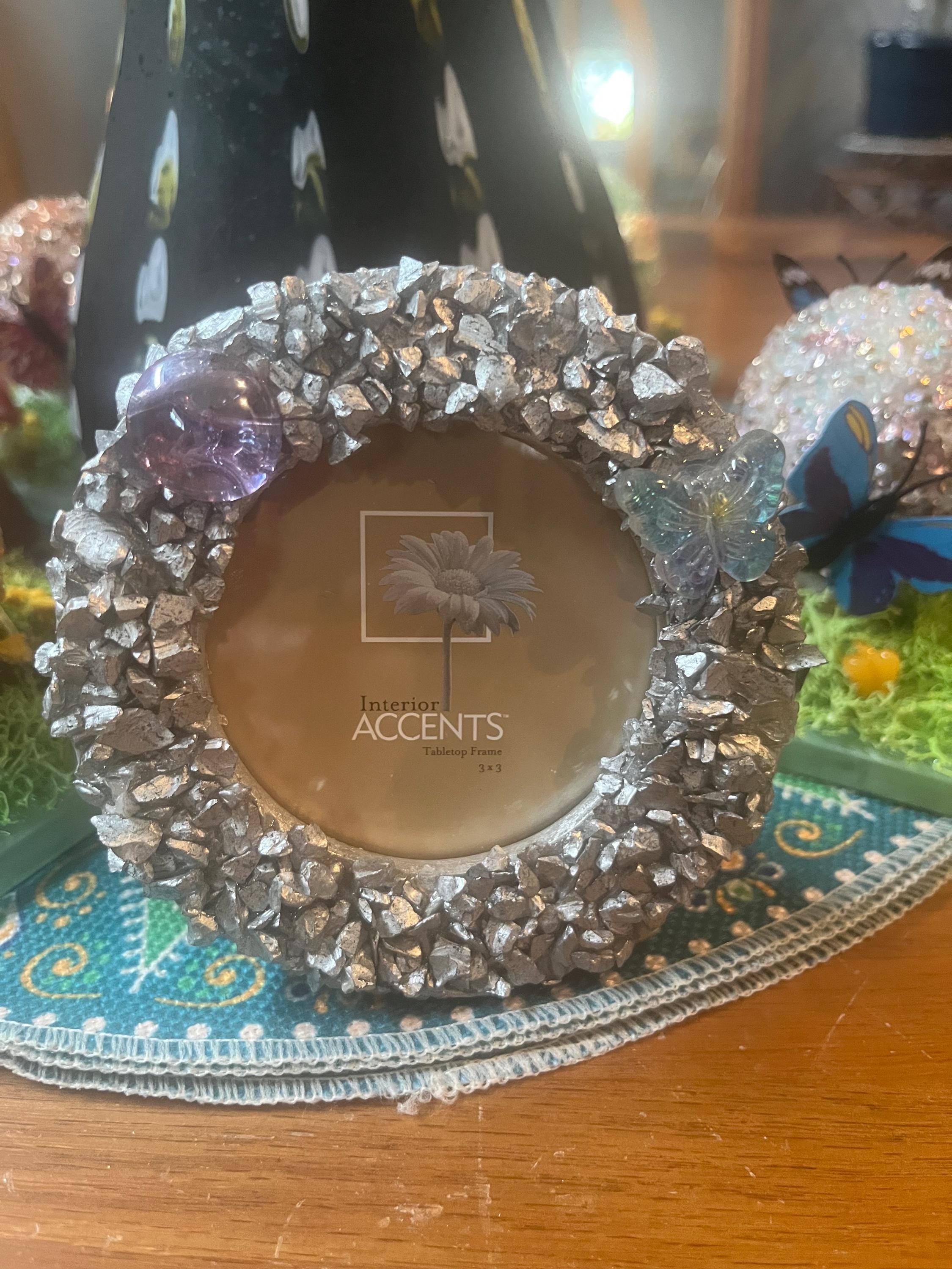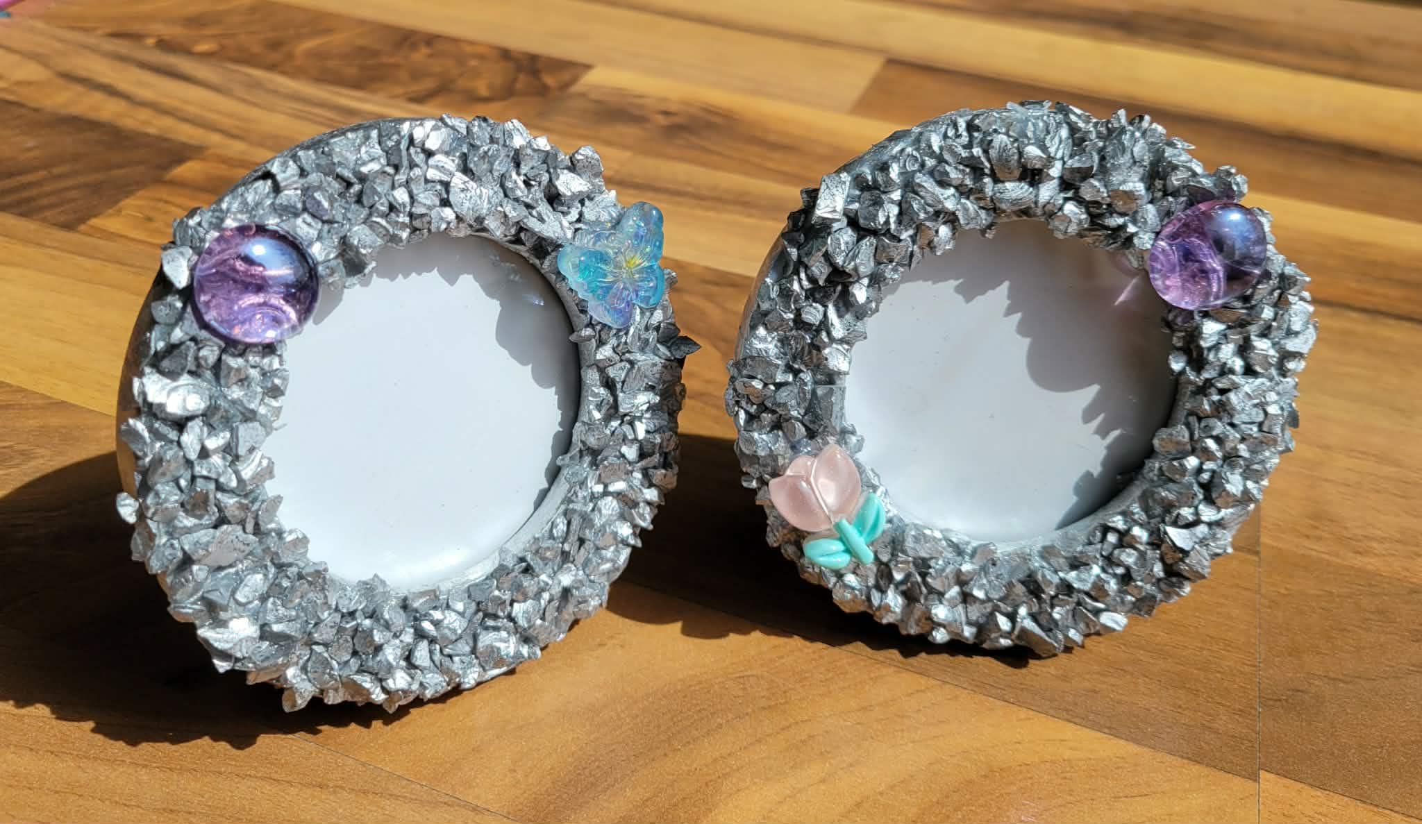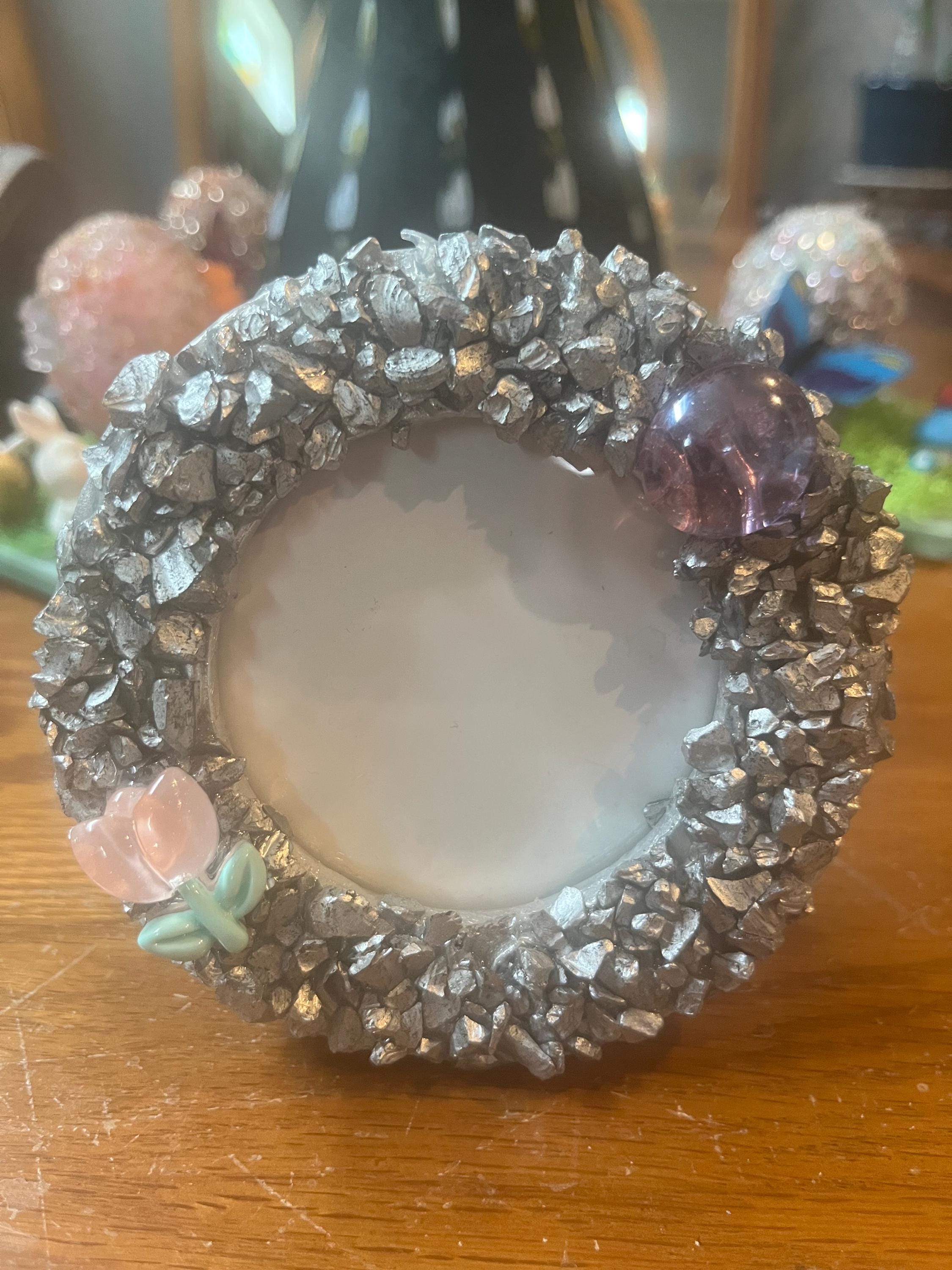 These are 3x3 picture frames that have been repurposed with whimsy. Great gift for anyone. An immediate smile comes with it! Made from crushed glass, a glass stone and resin figurine.